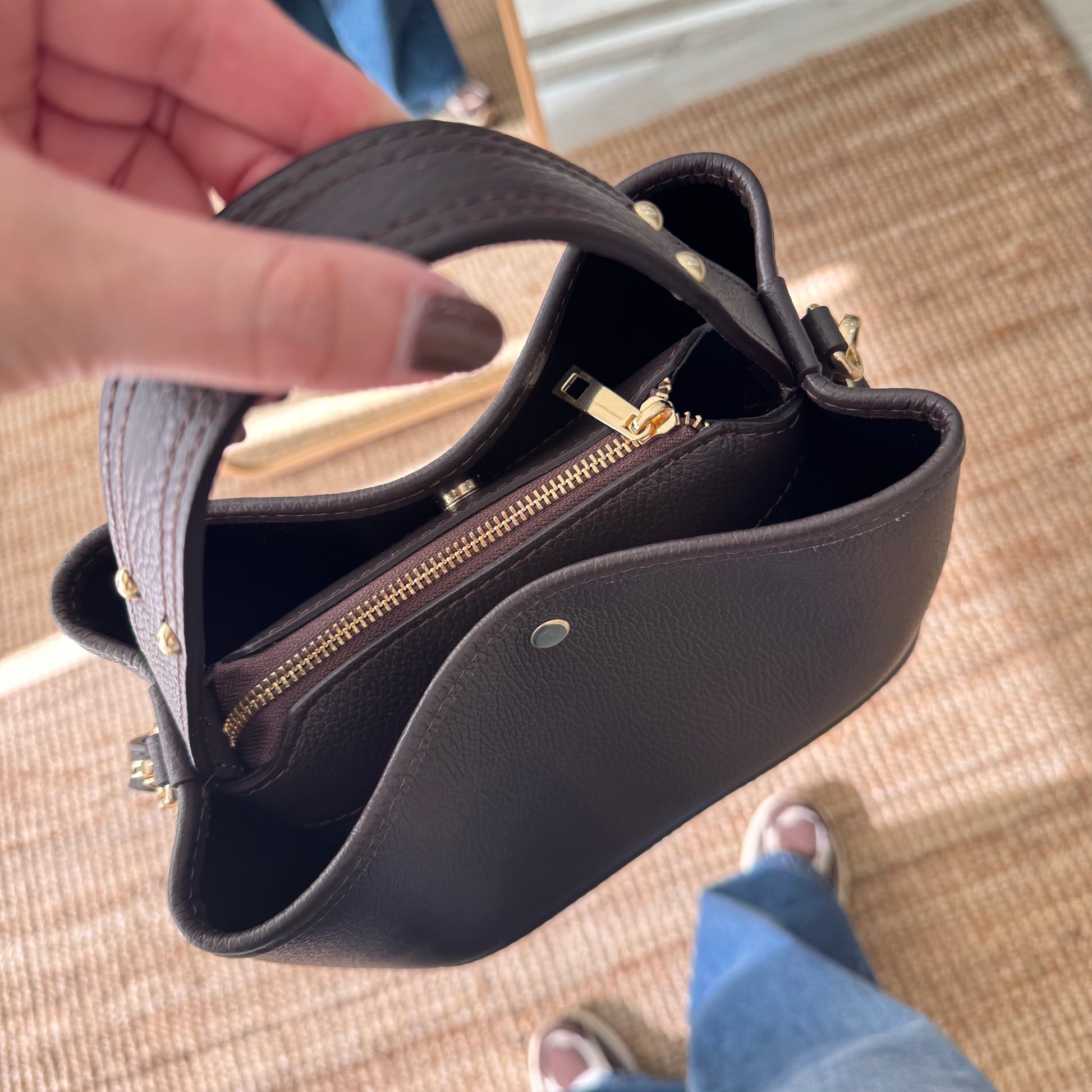 Nuestro bolso en forma de trapecio con asa en piel de color marrón, para llevarlo con estilo.