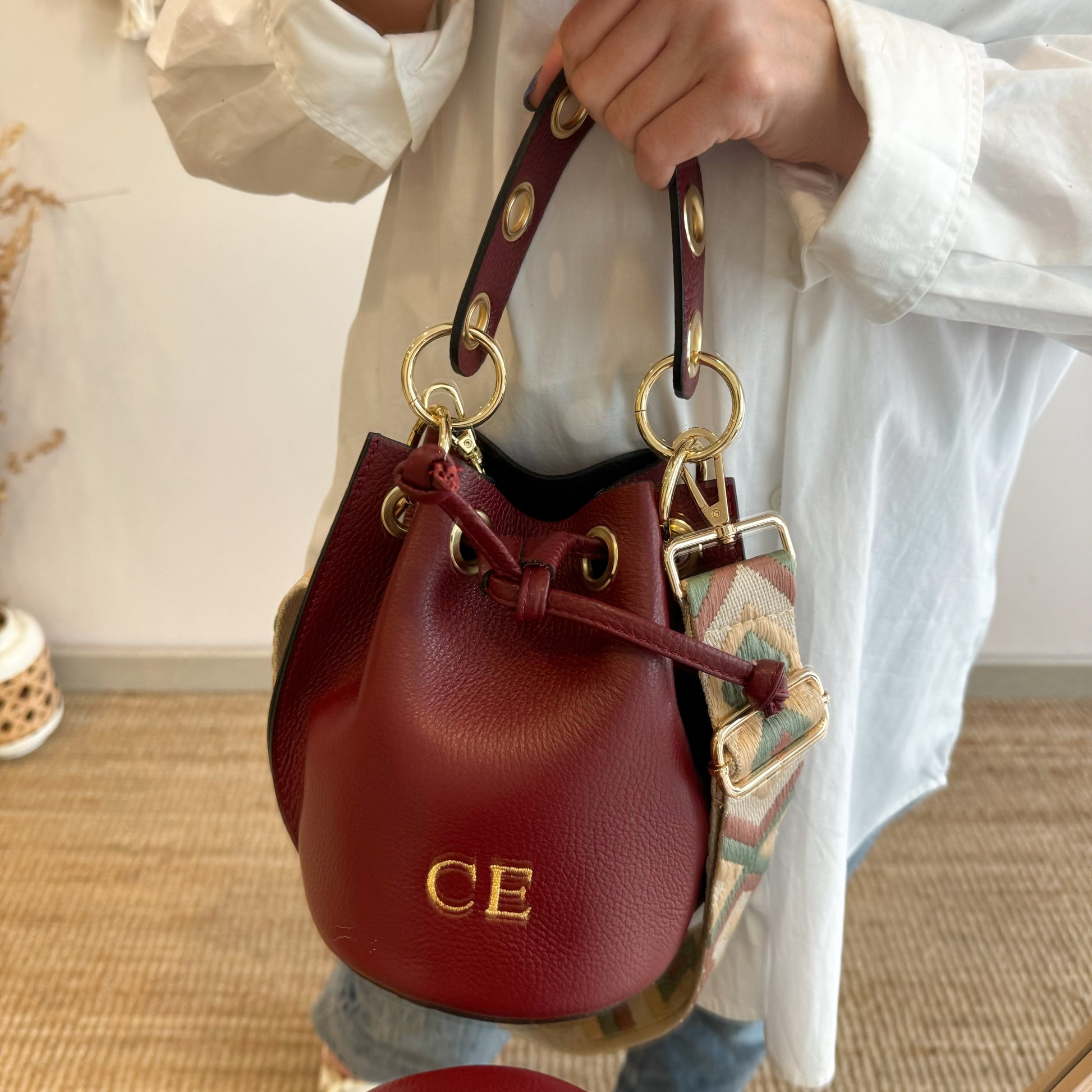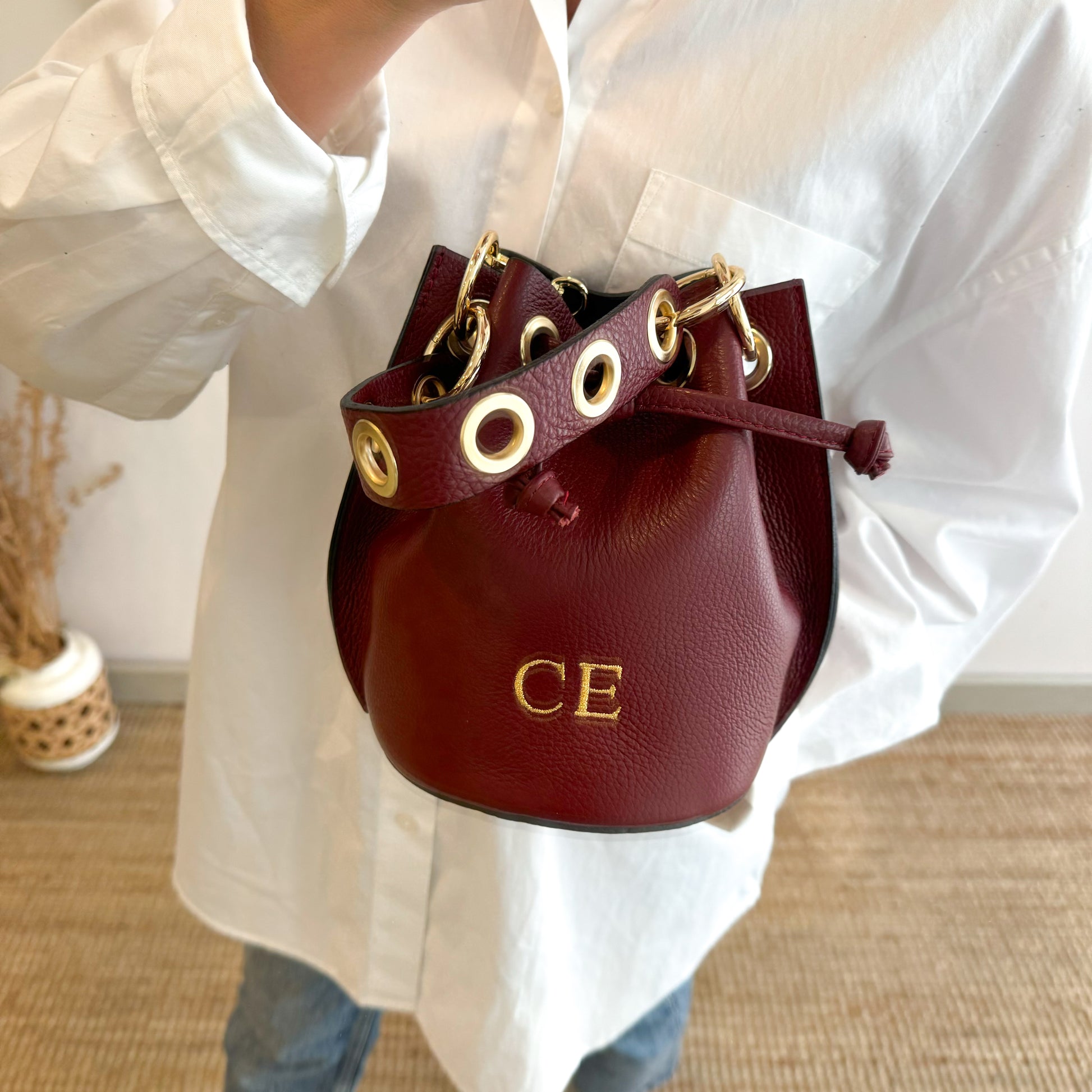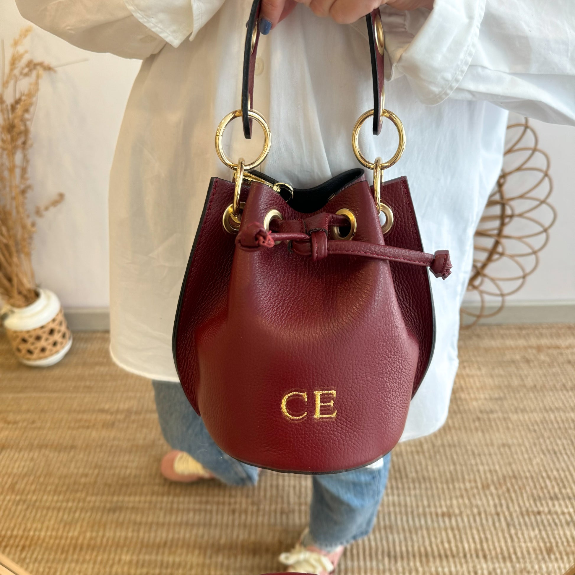 Bombonera piel granate arandelas doradas iniciales bordadas