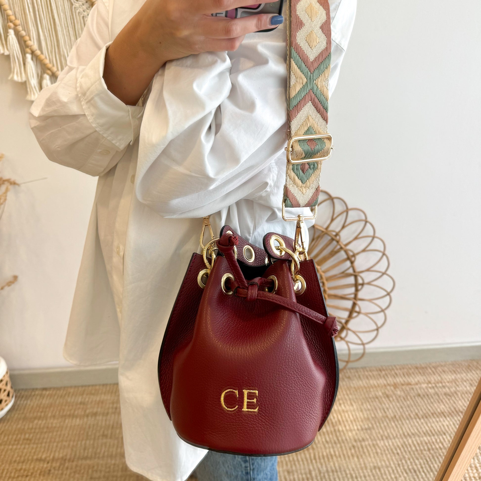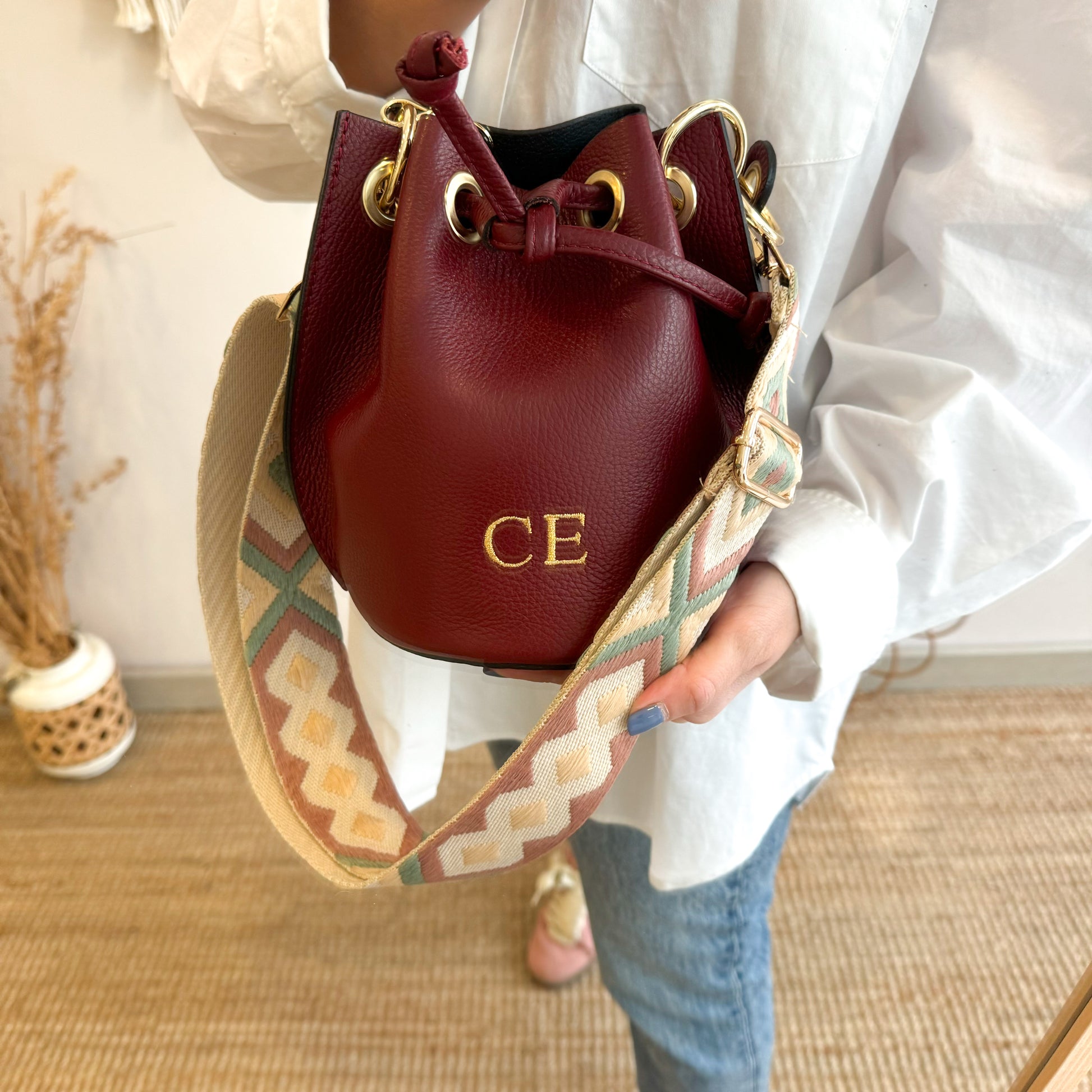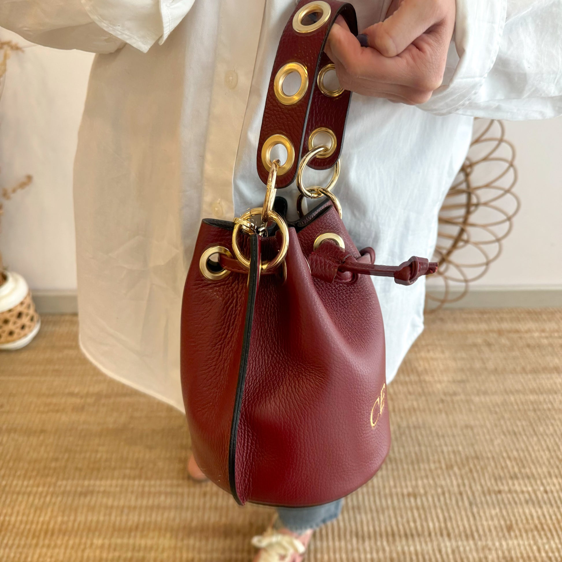 Bombonera piel granate arandelas doradas iniciales bordadas