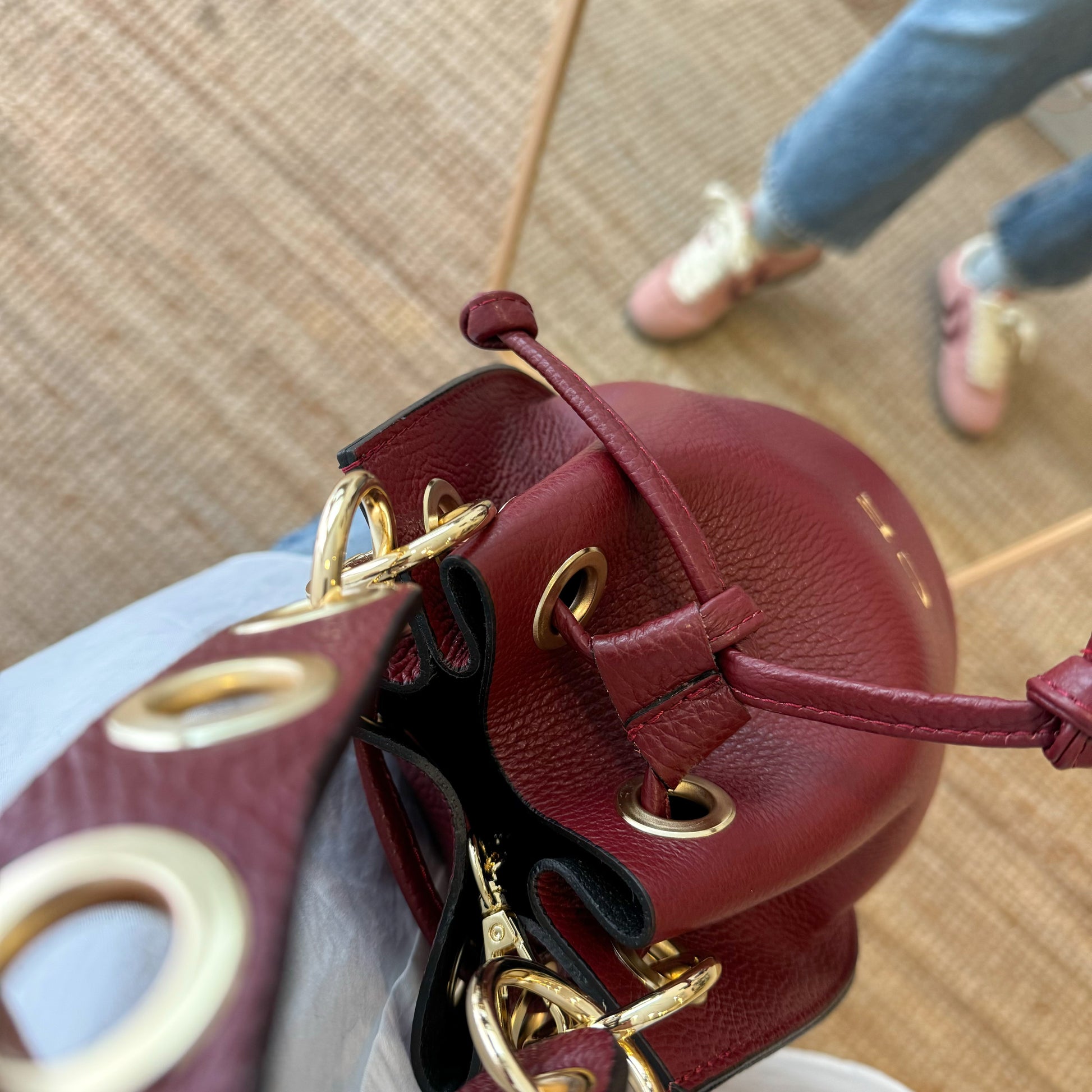 Lleva un asa corta con arandelas y otra correa metálica en dorado y con acabado en piel color granate, le otorga un toque especial