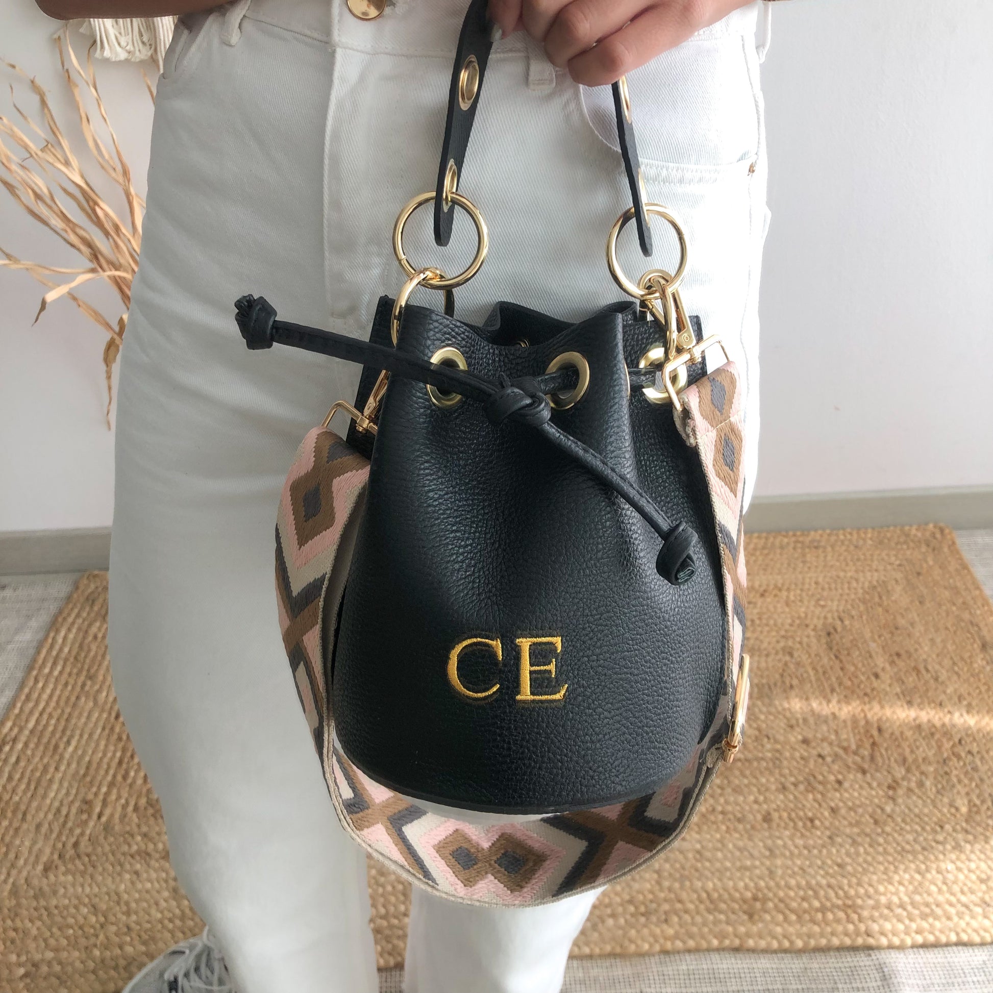 Bombonera piel negro arandelas doradas iniciales bordadas