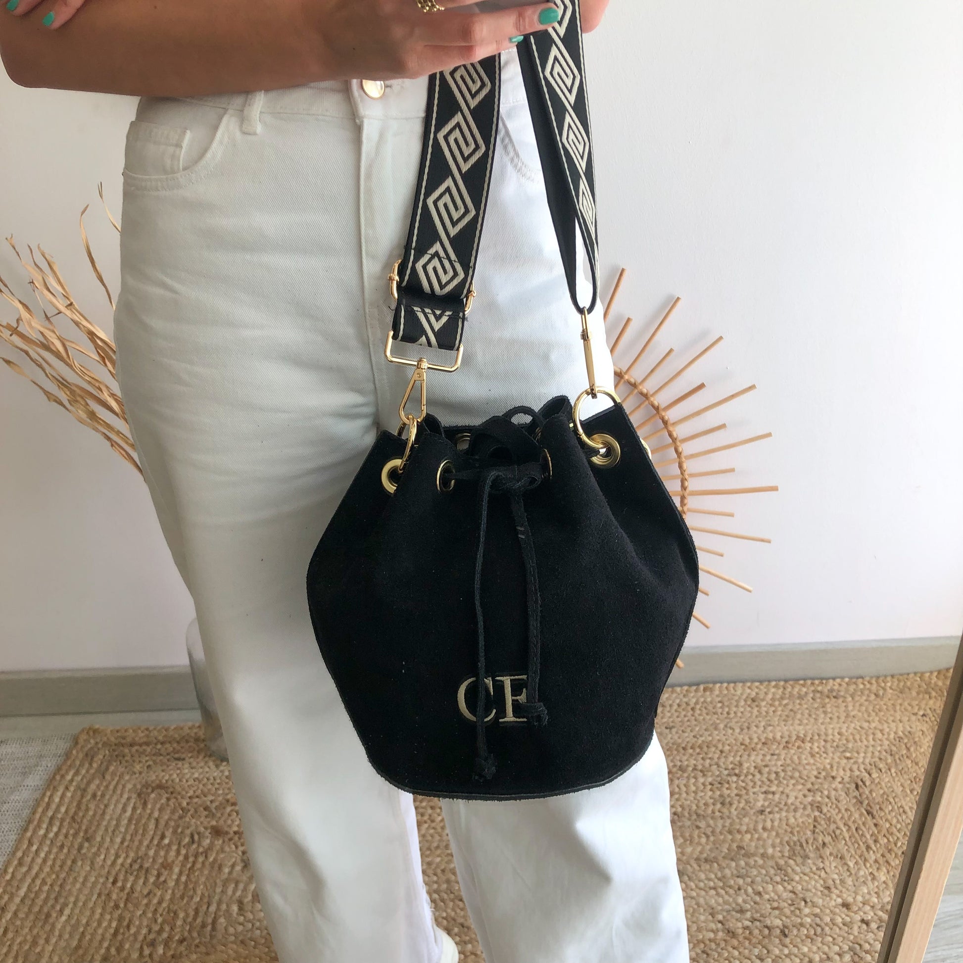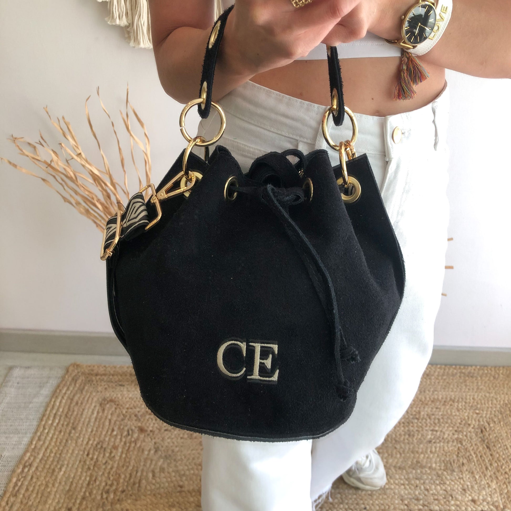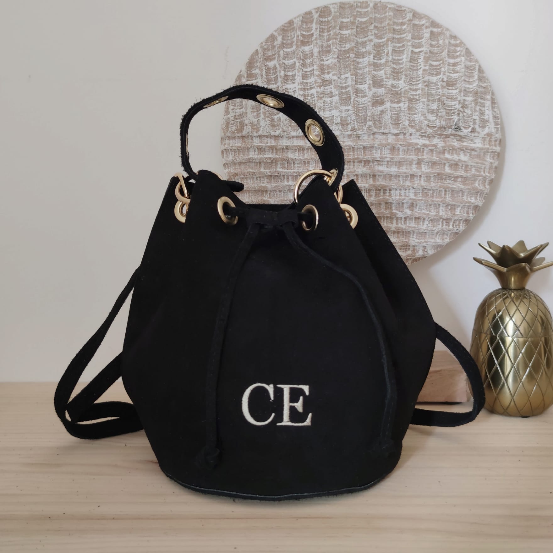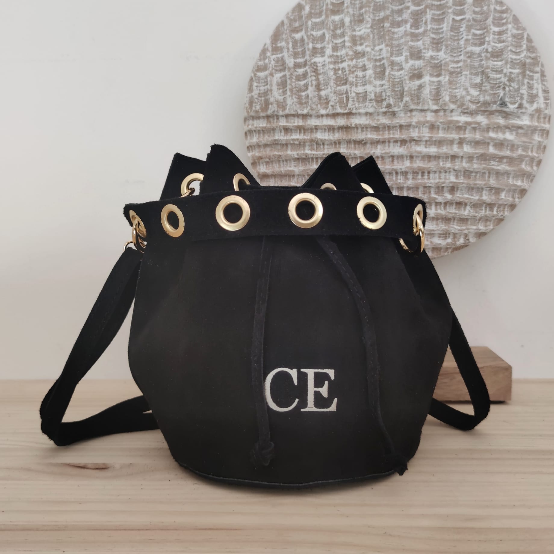 Bombonera serraje negro arandelas doradas iniciales bordadas