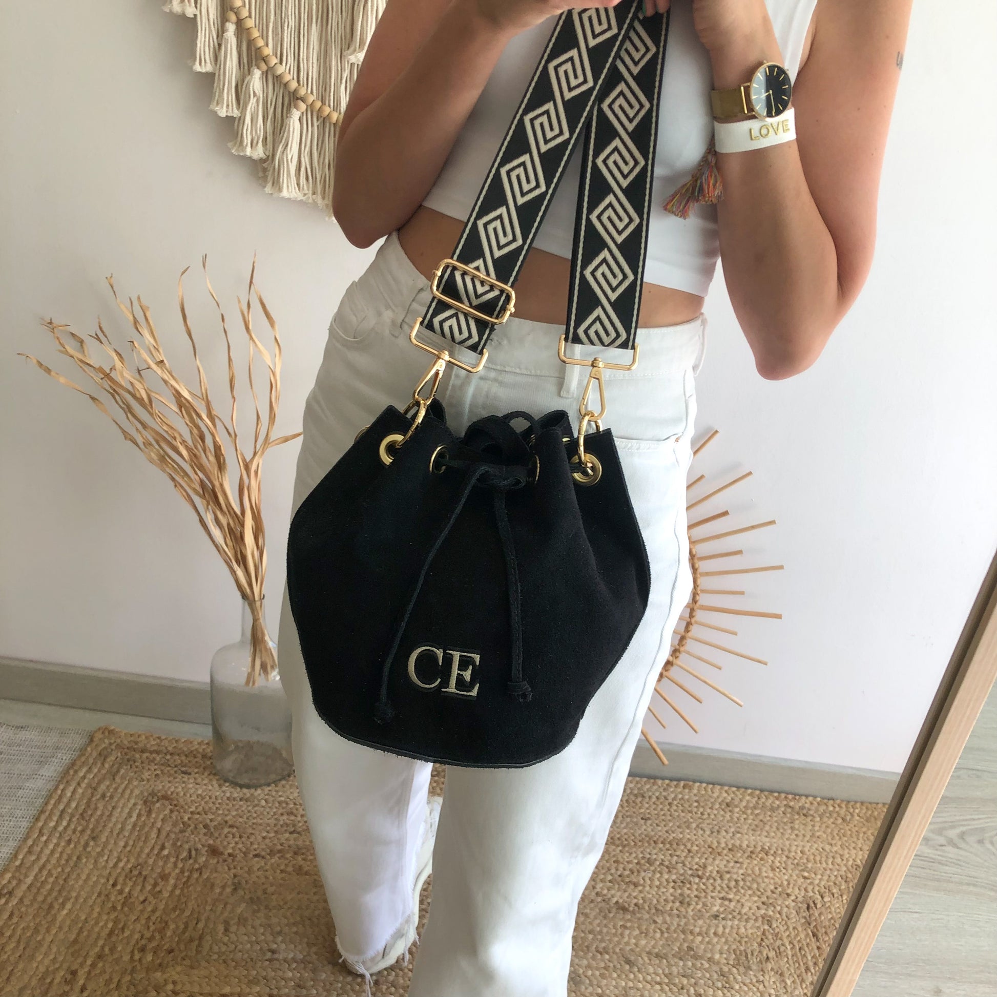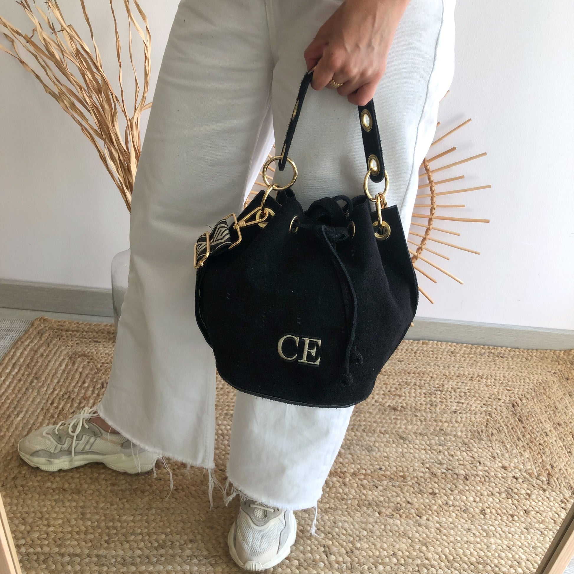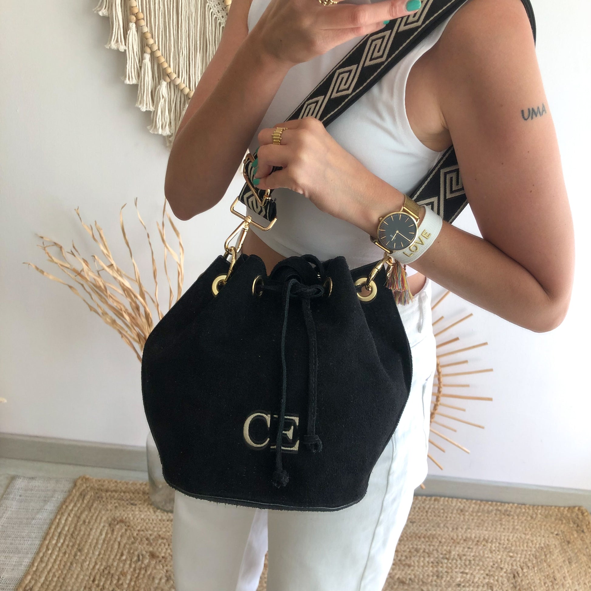 Lleva una asa corta con arandelas en dorado y otra fina larga de serraje.