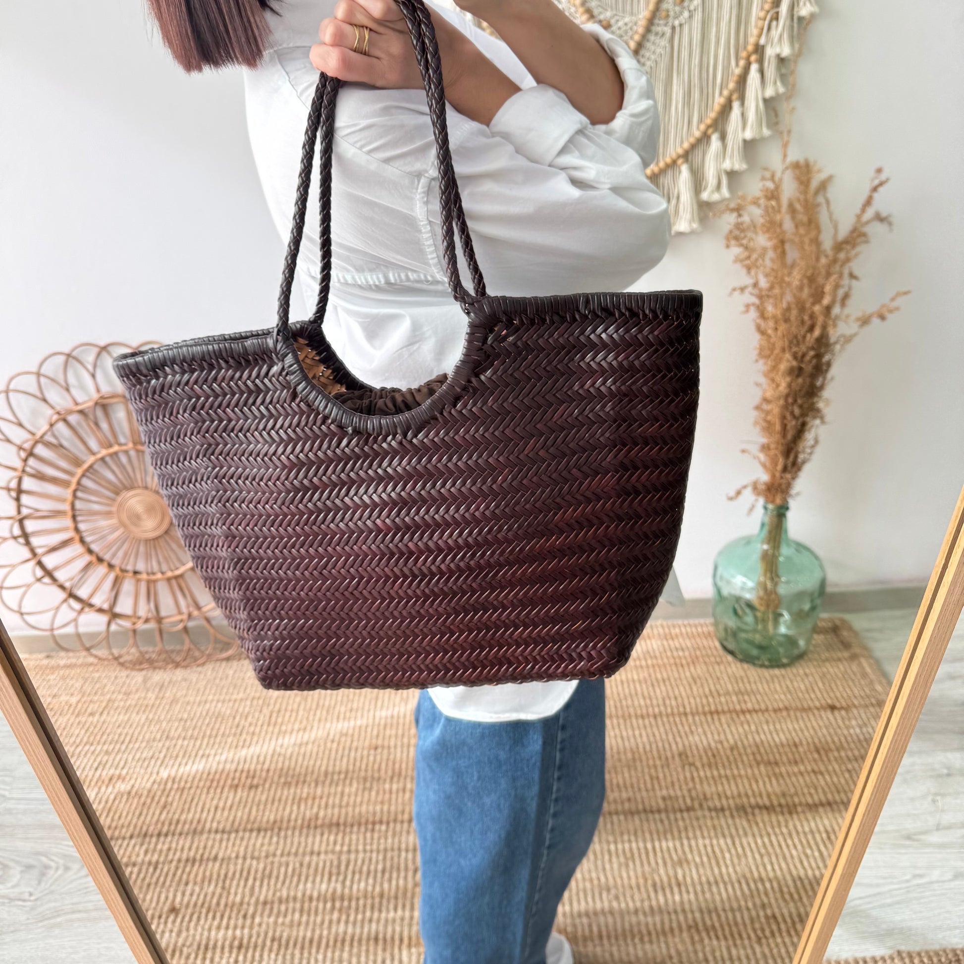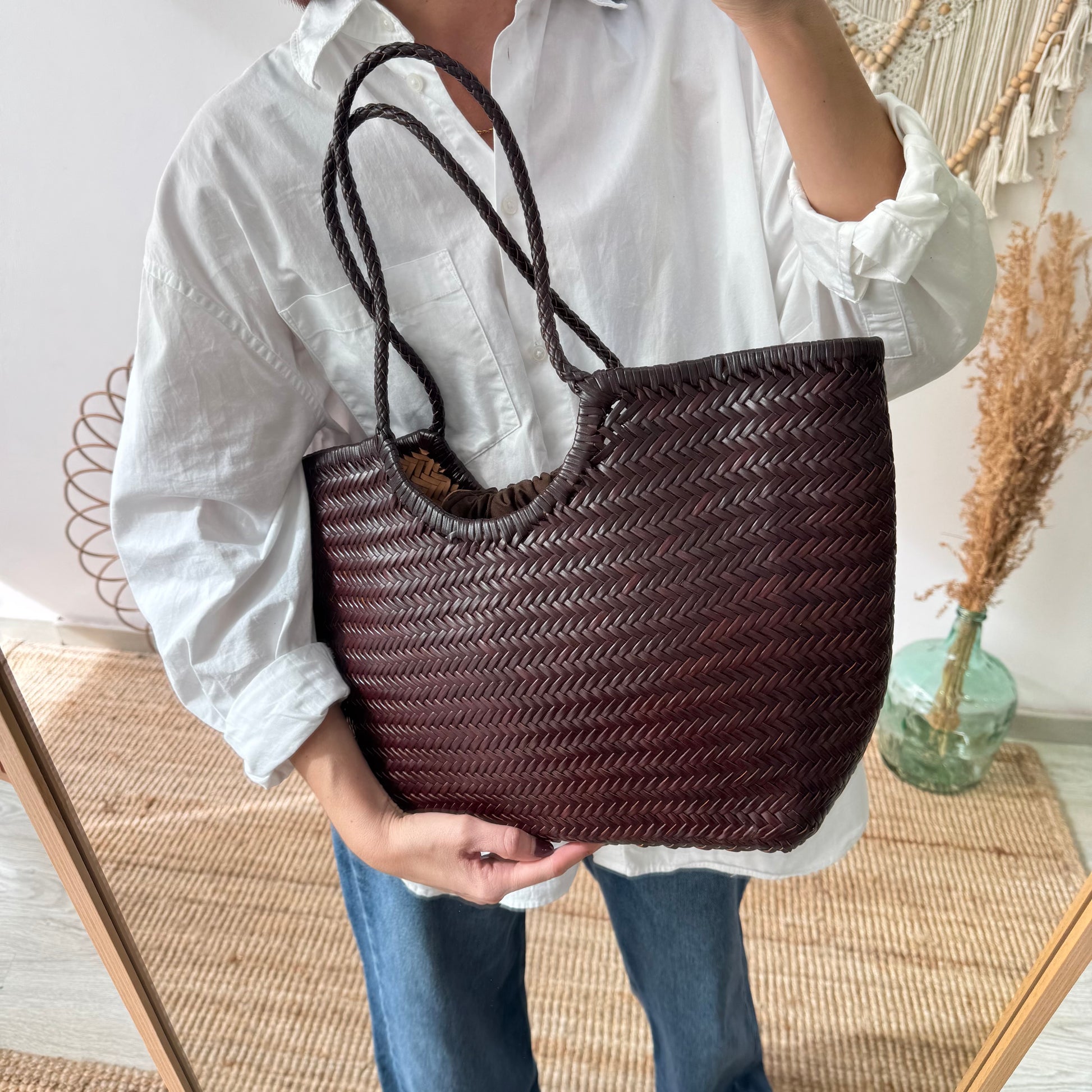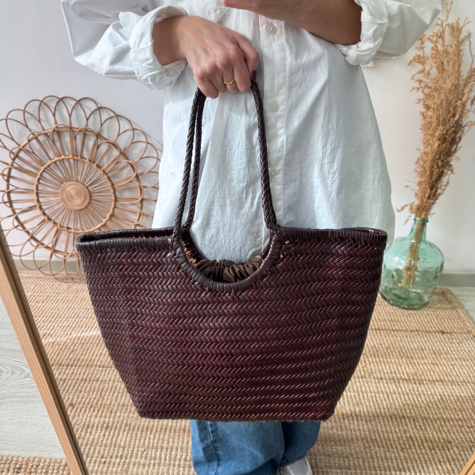 Capazo construido con piel trenzada color marrón chocolate, una opción perfecta para cualquier estilo.