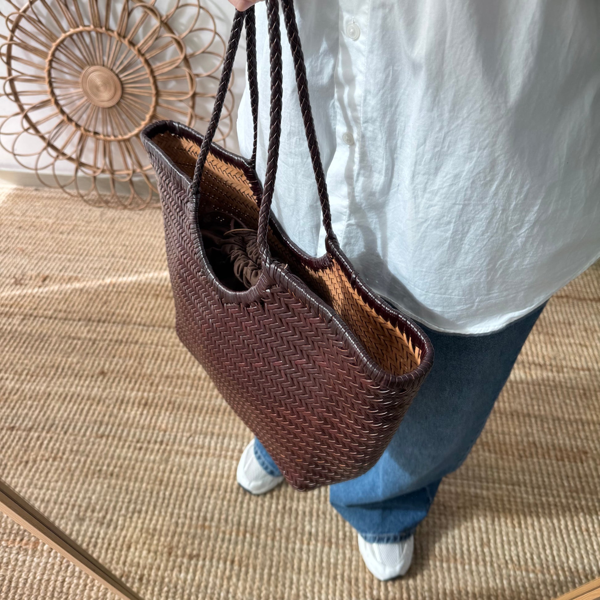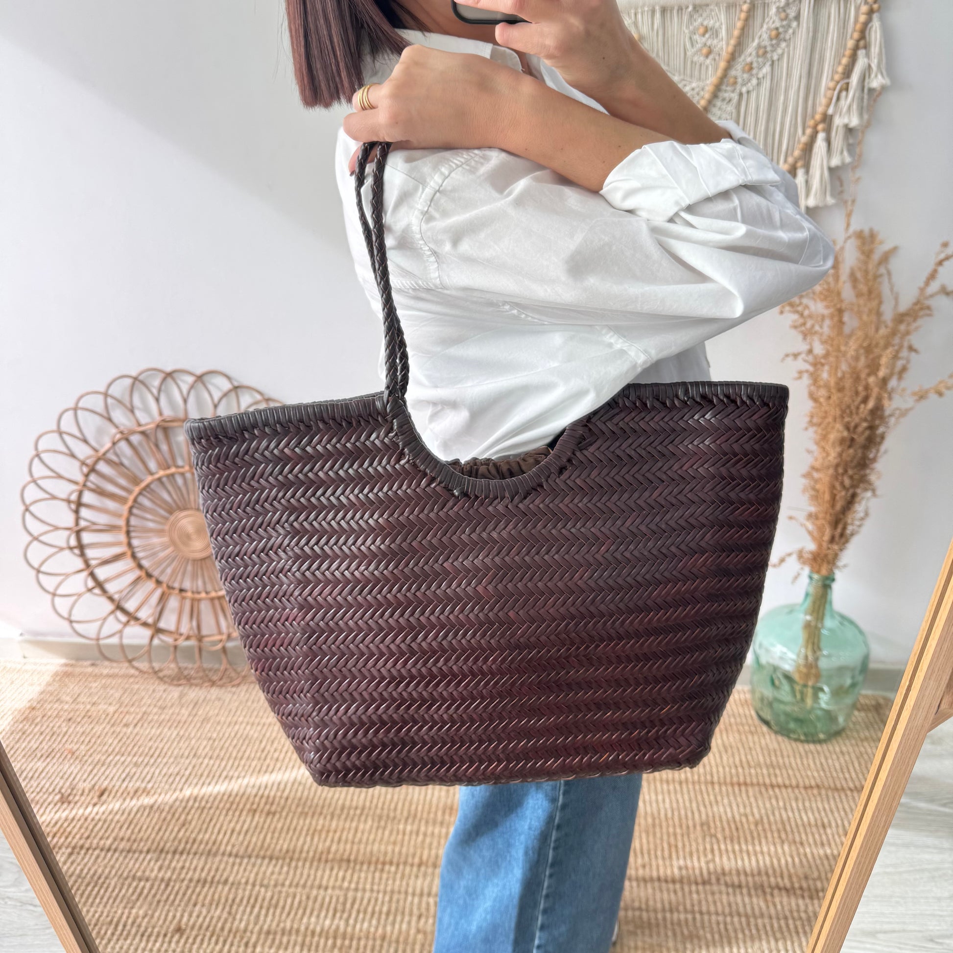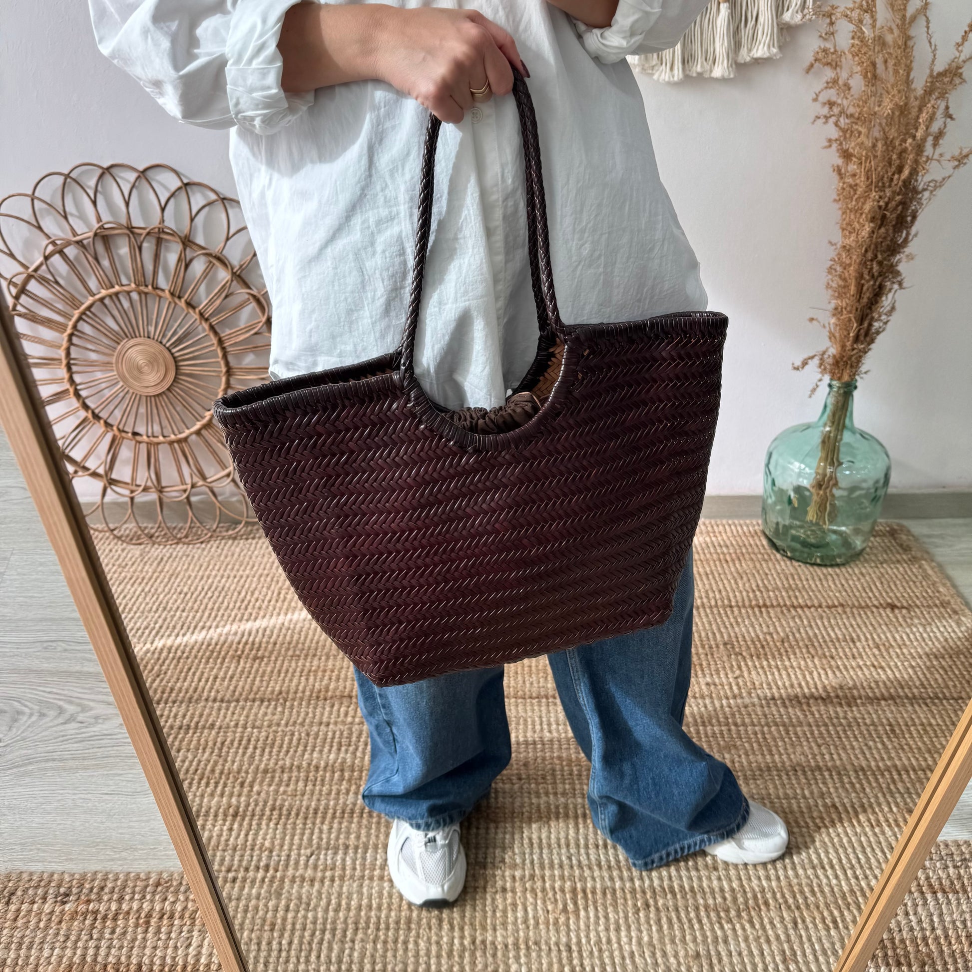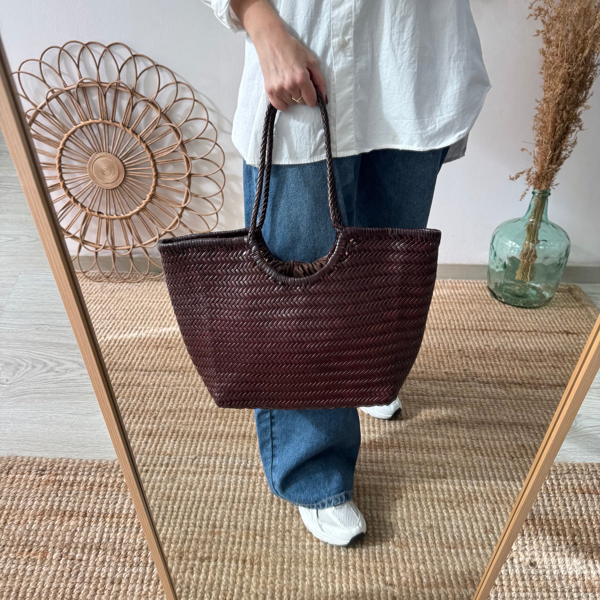 Capazo construido con piel trenzada color marrón chocolate, una opción perfecta para cualquier estilo.