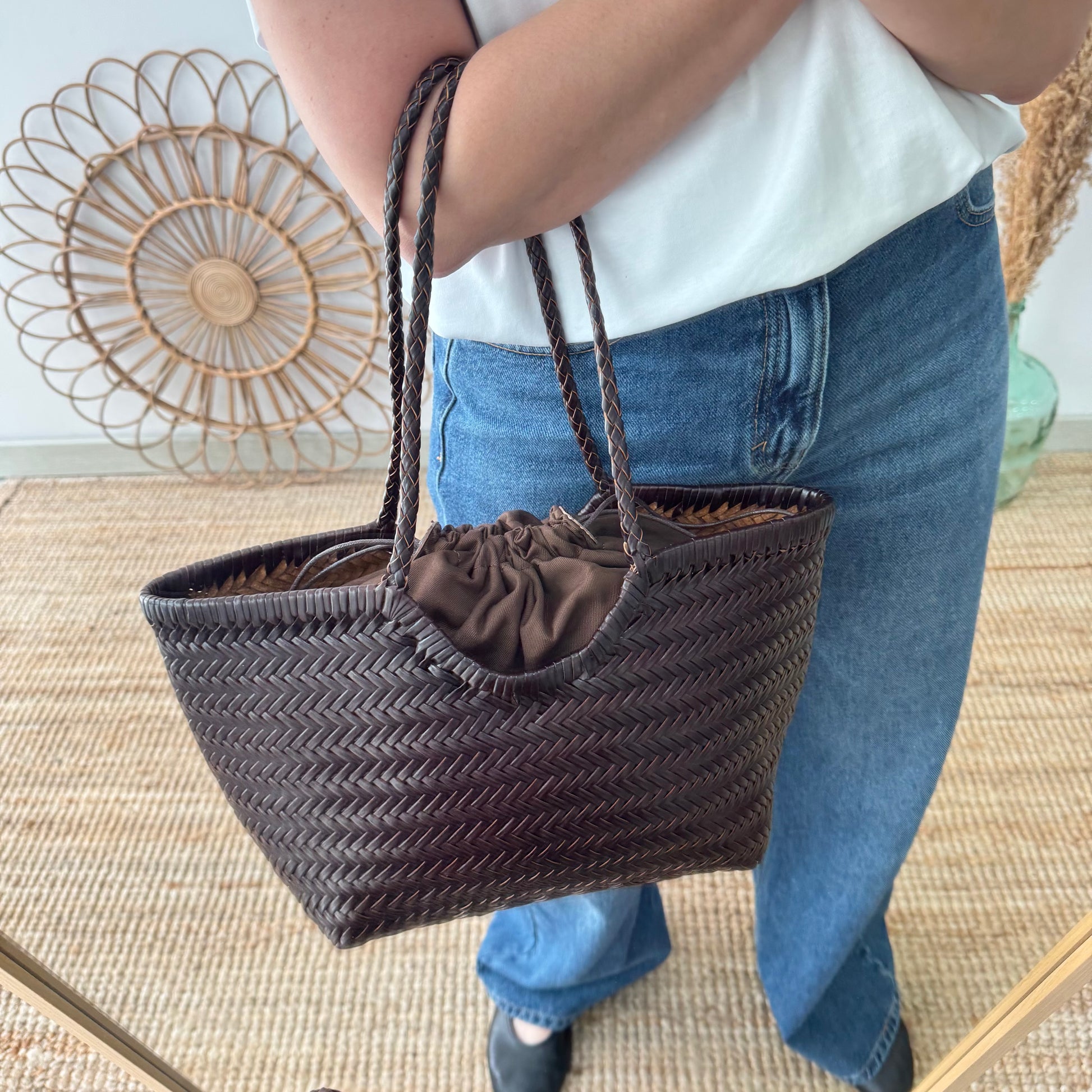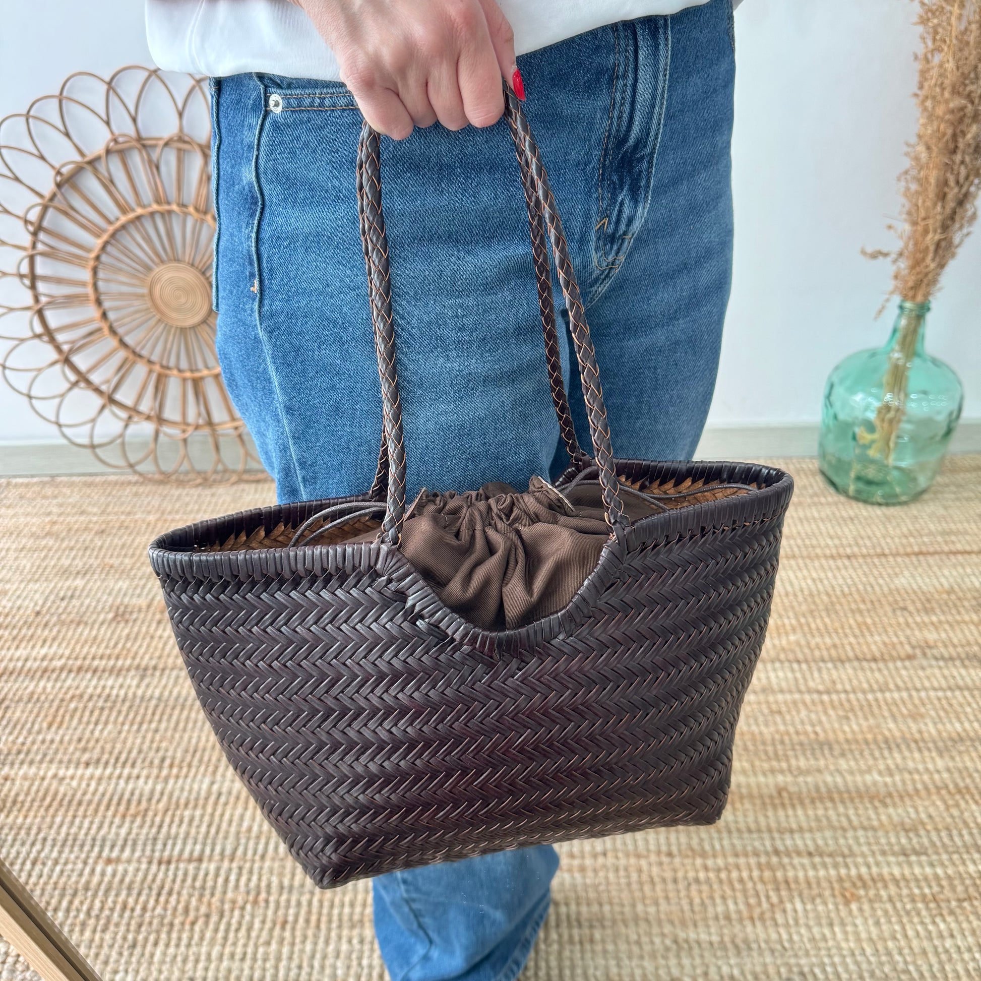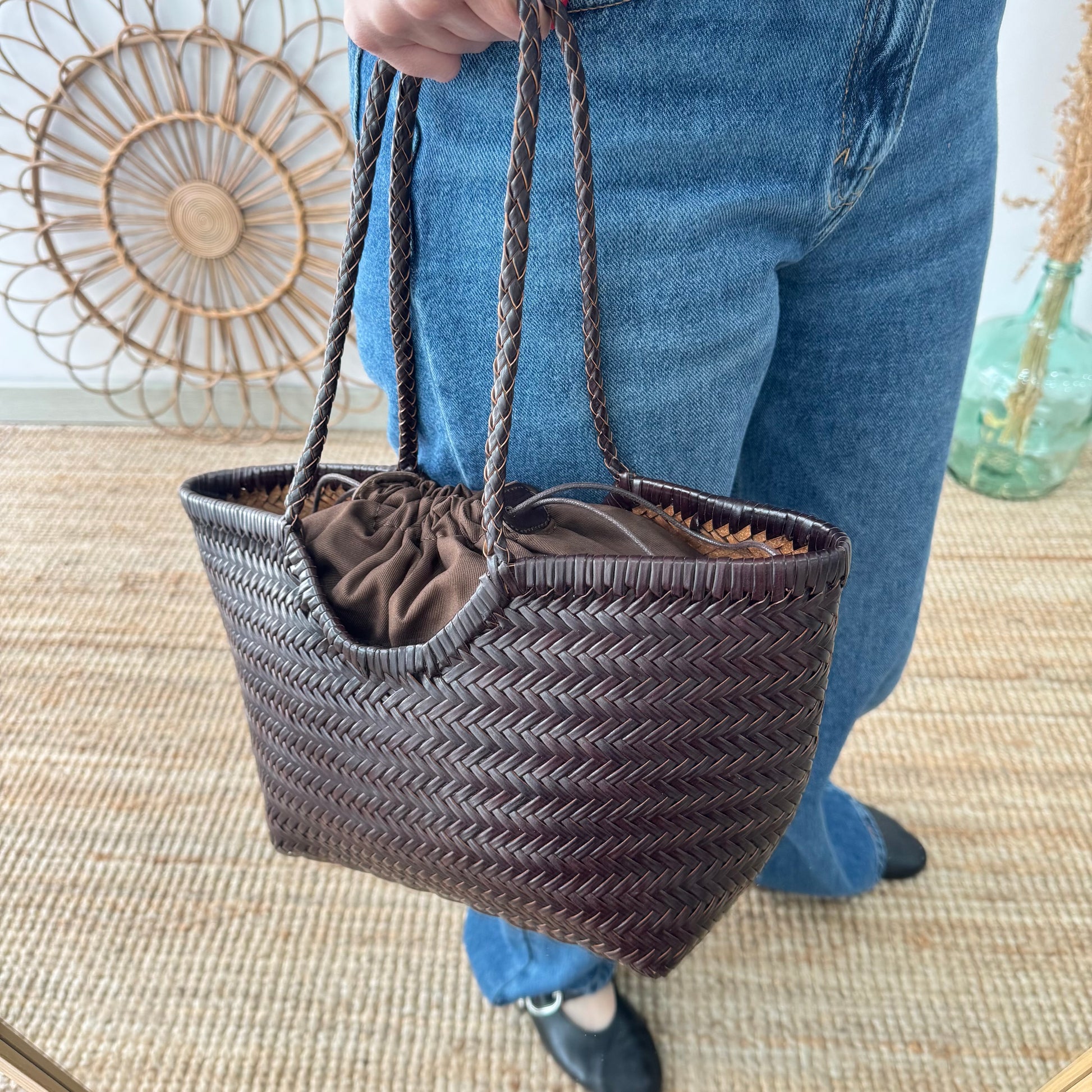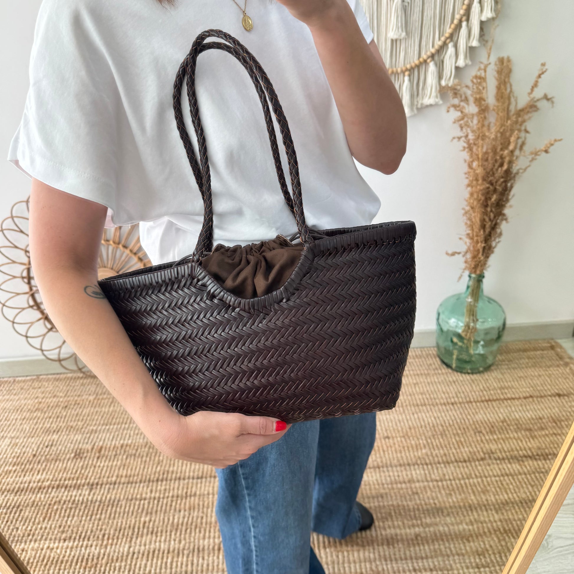 Capazo construido con piel trenzada color marrón chocolate, una opción perfecta para cualquier estilo.