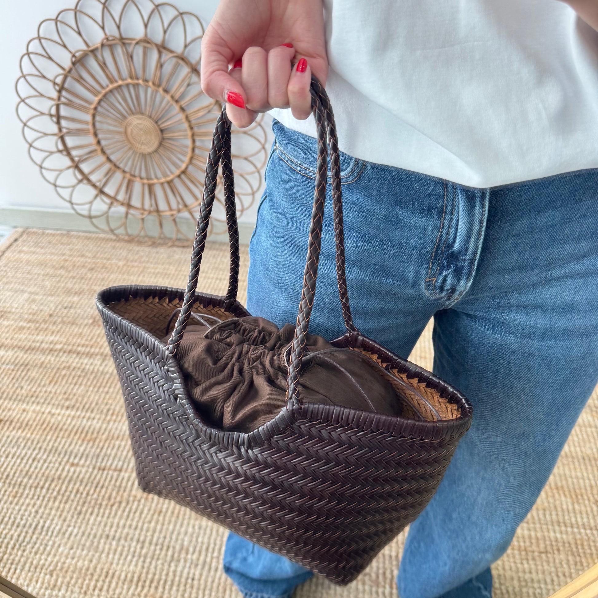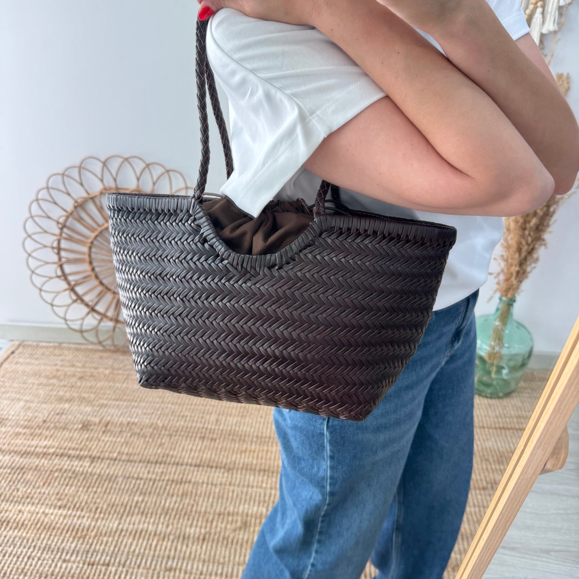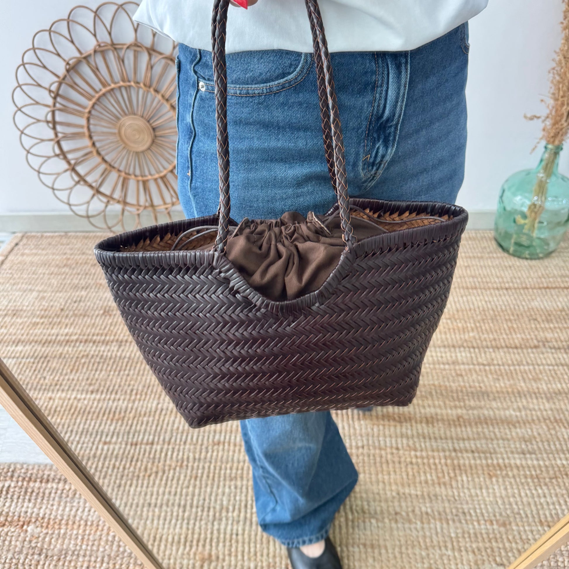 Capazo construido con piel trenzada color marrón chocolate, una opción perfecta para cualquier estilo.