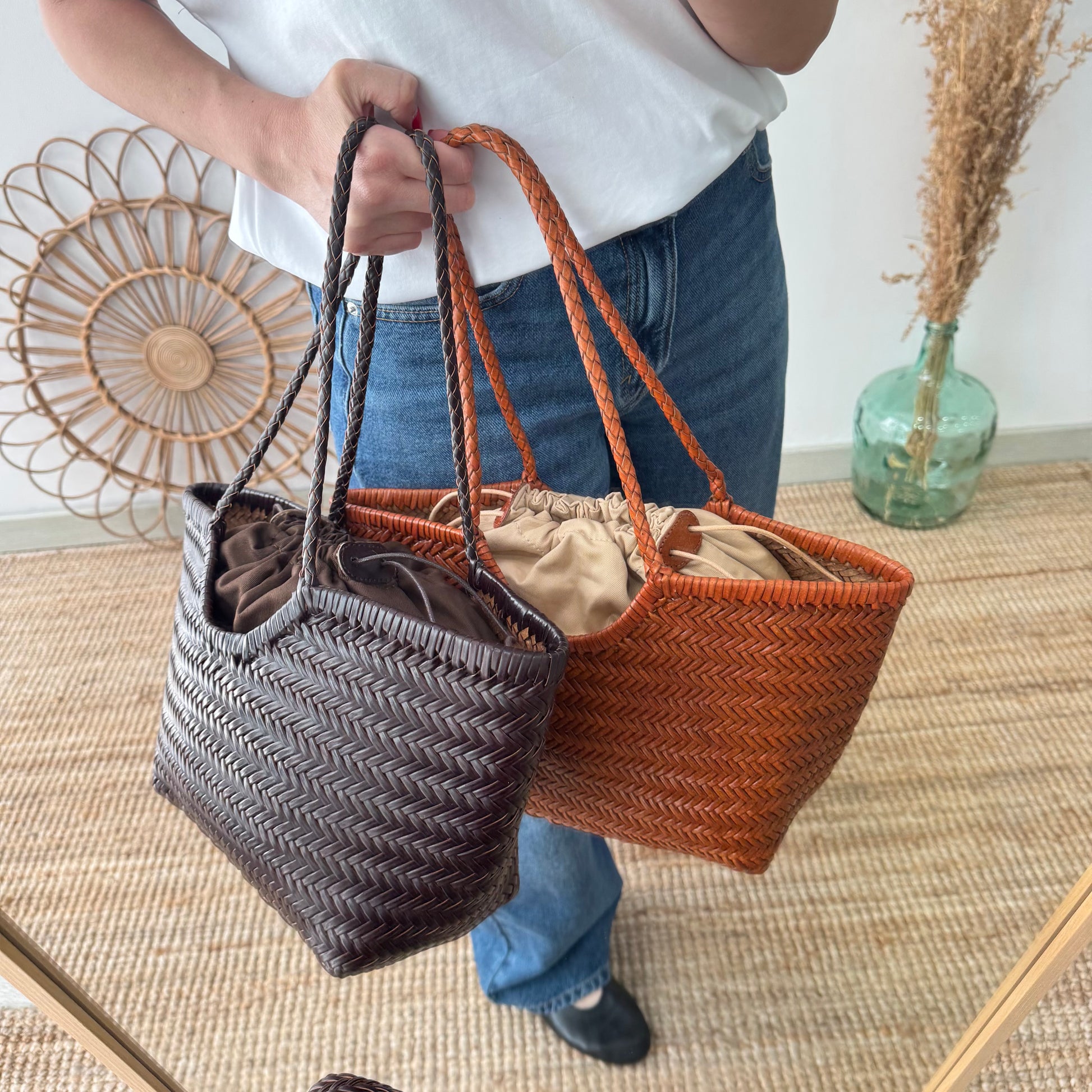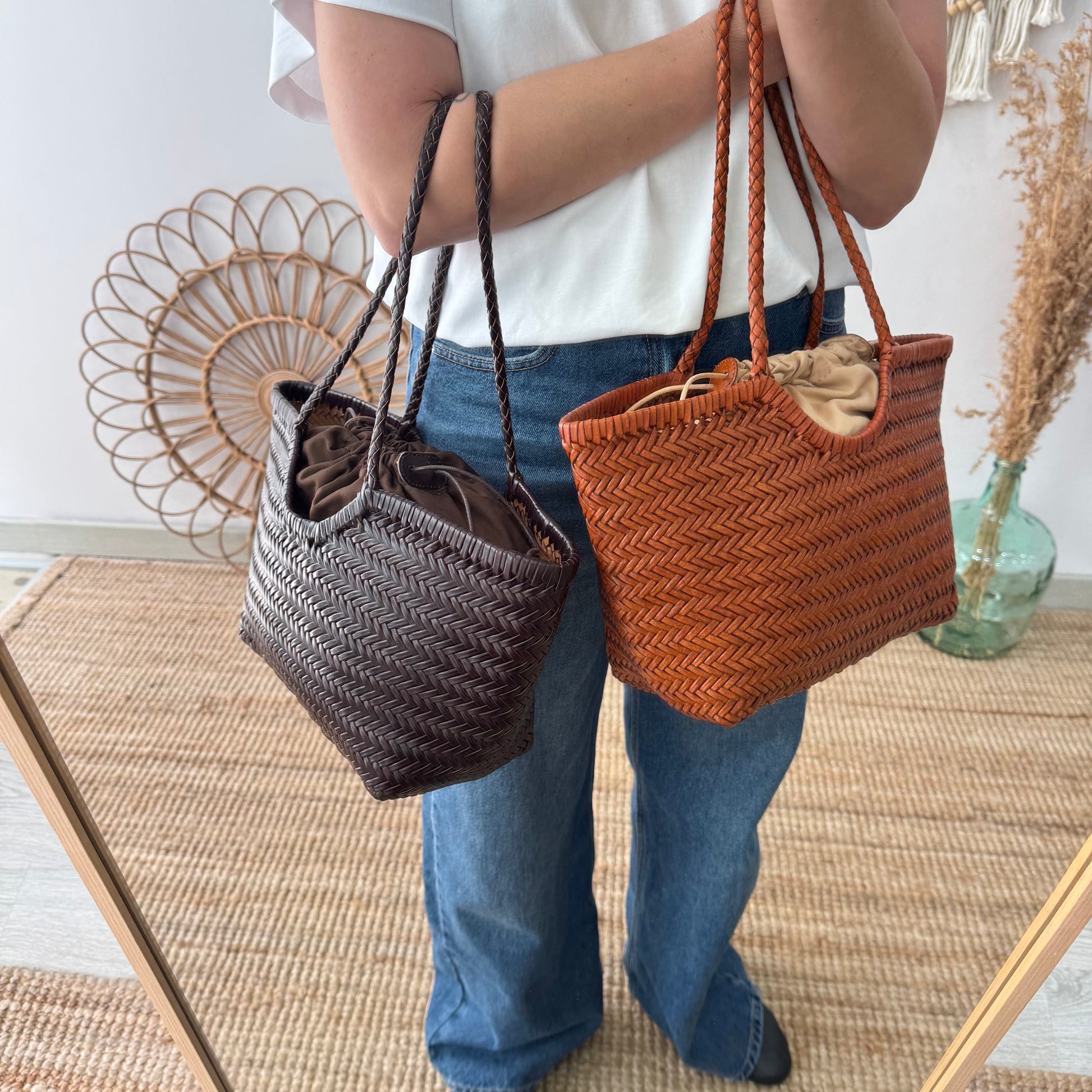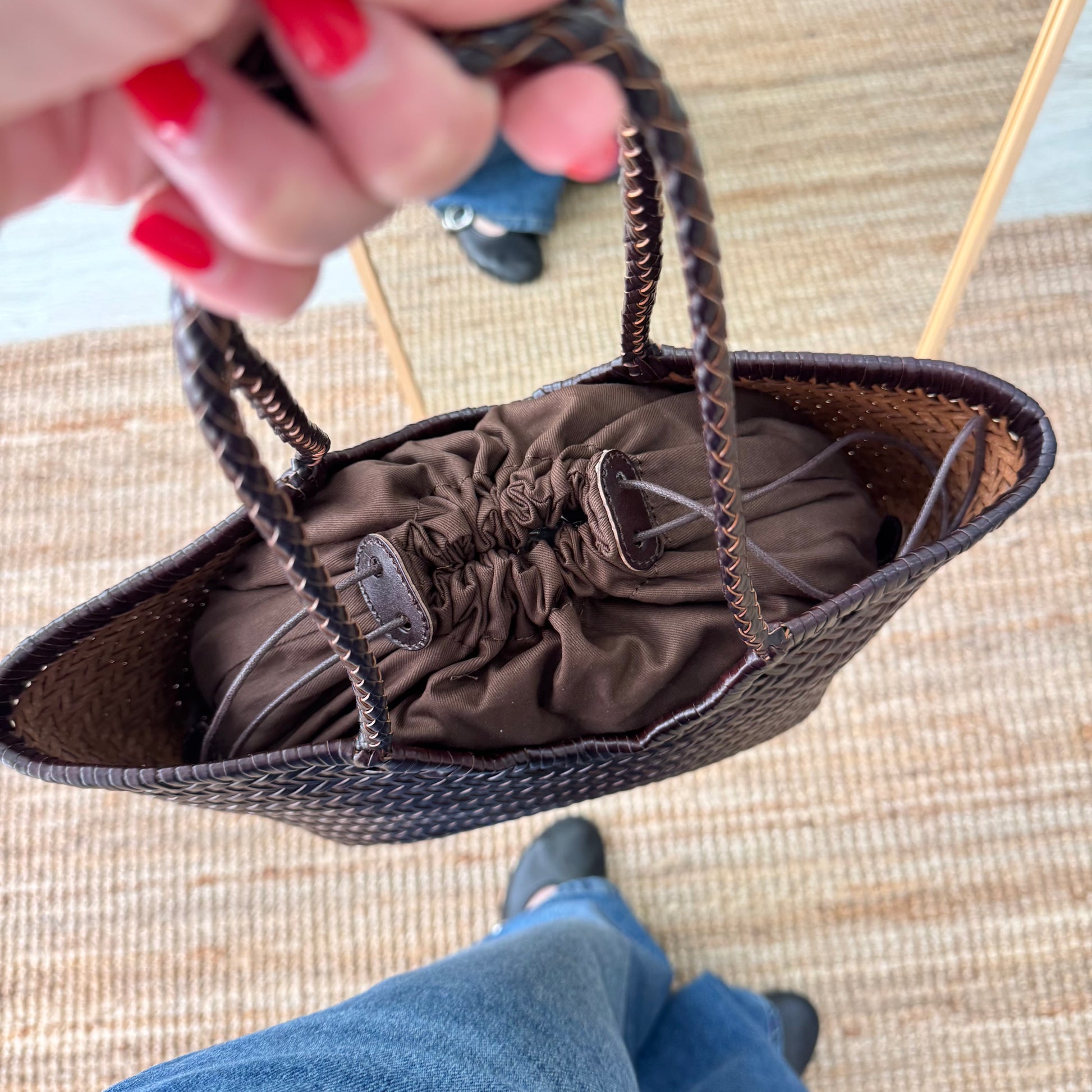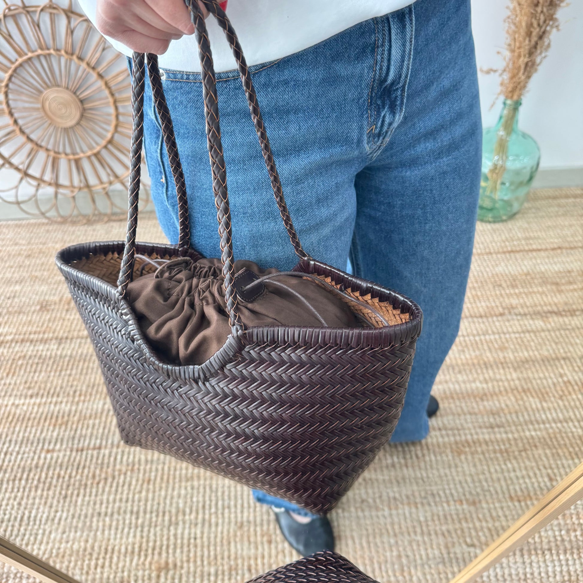 Capazo construido con piel trenzada color marrón chocolate, una opción perfecta para cualquier estilo.