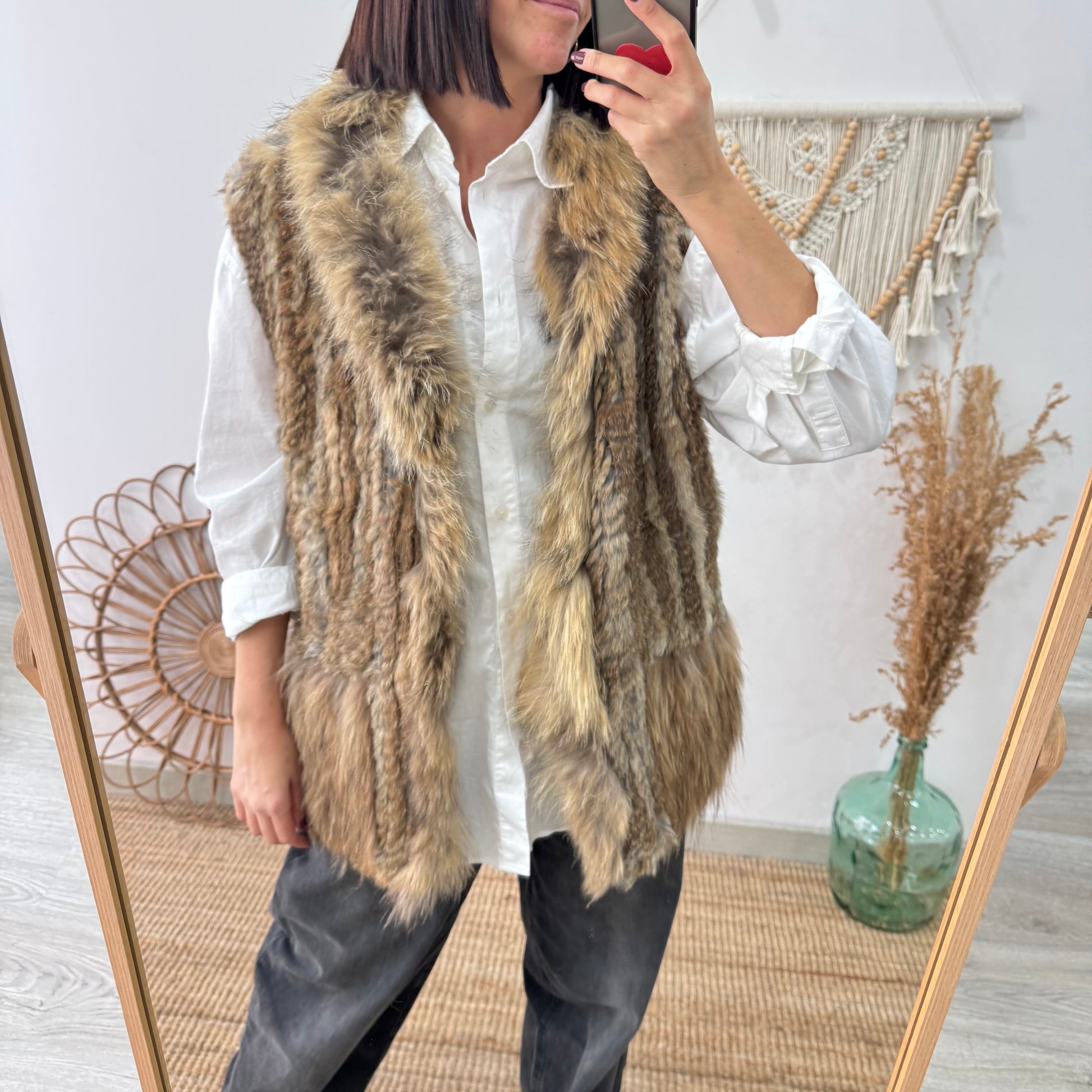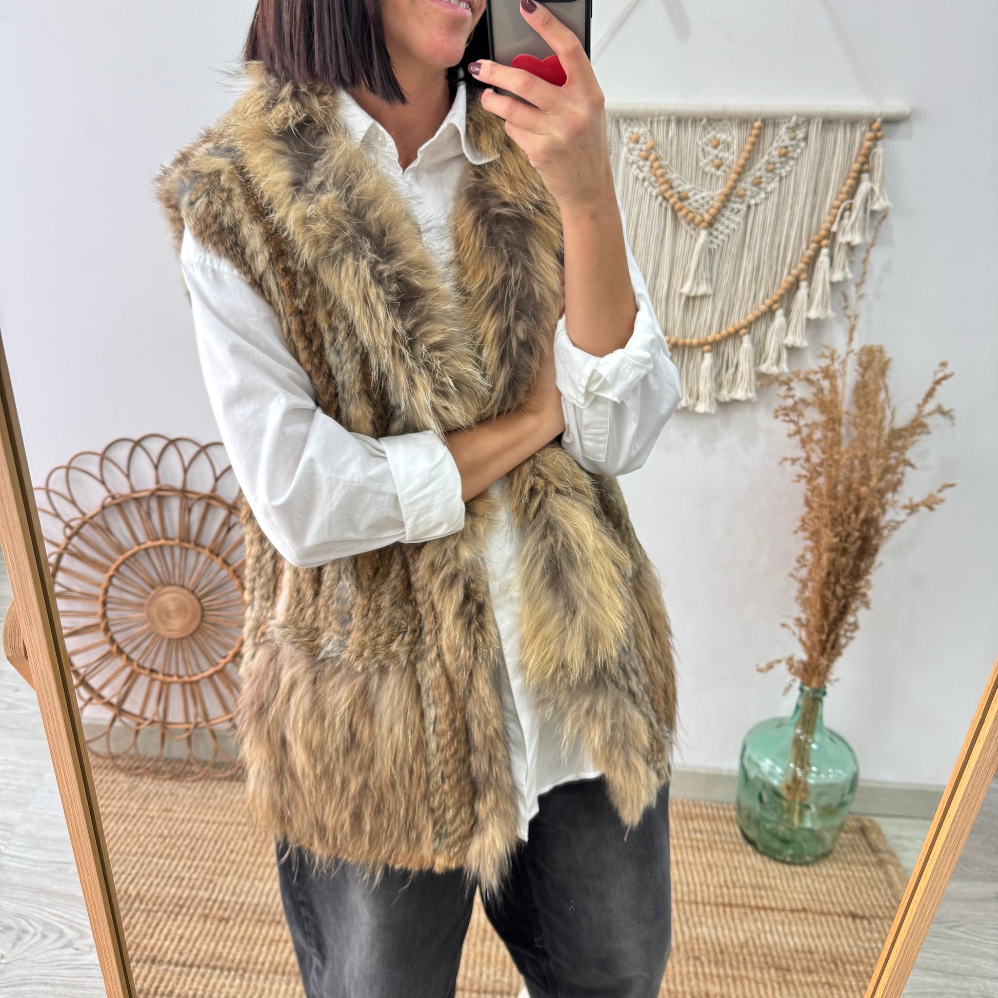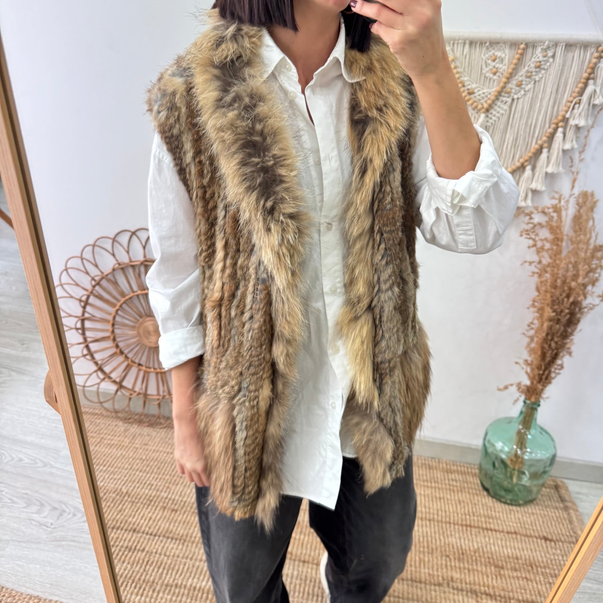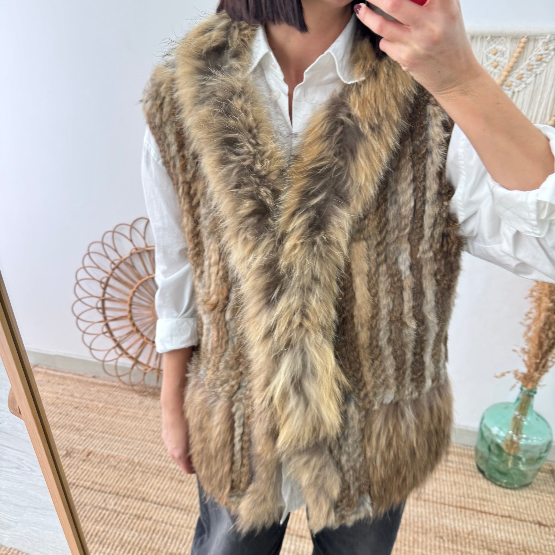 Un clásico reinventado para los días fríos. El chaleco de conejo y zorro natural – tono mezcla beige y caramelo combina suavidad, calidez y elegancia en una prenda que eleva cualquier look al instante. Su textura envolvente y el brillo sutil del pelo natural lo convierten en una pieza única, pensada para disfrutar del invierno con estilo.