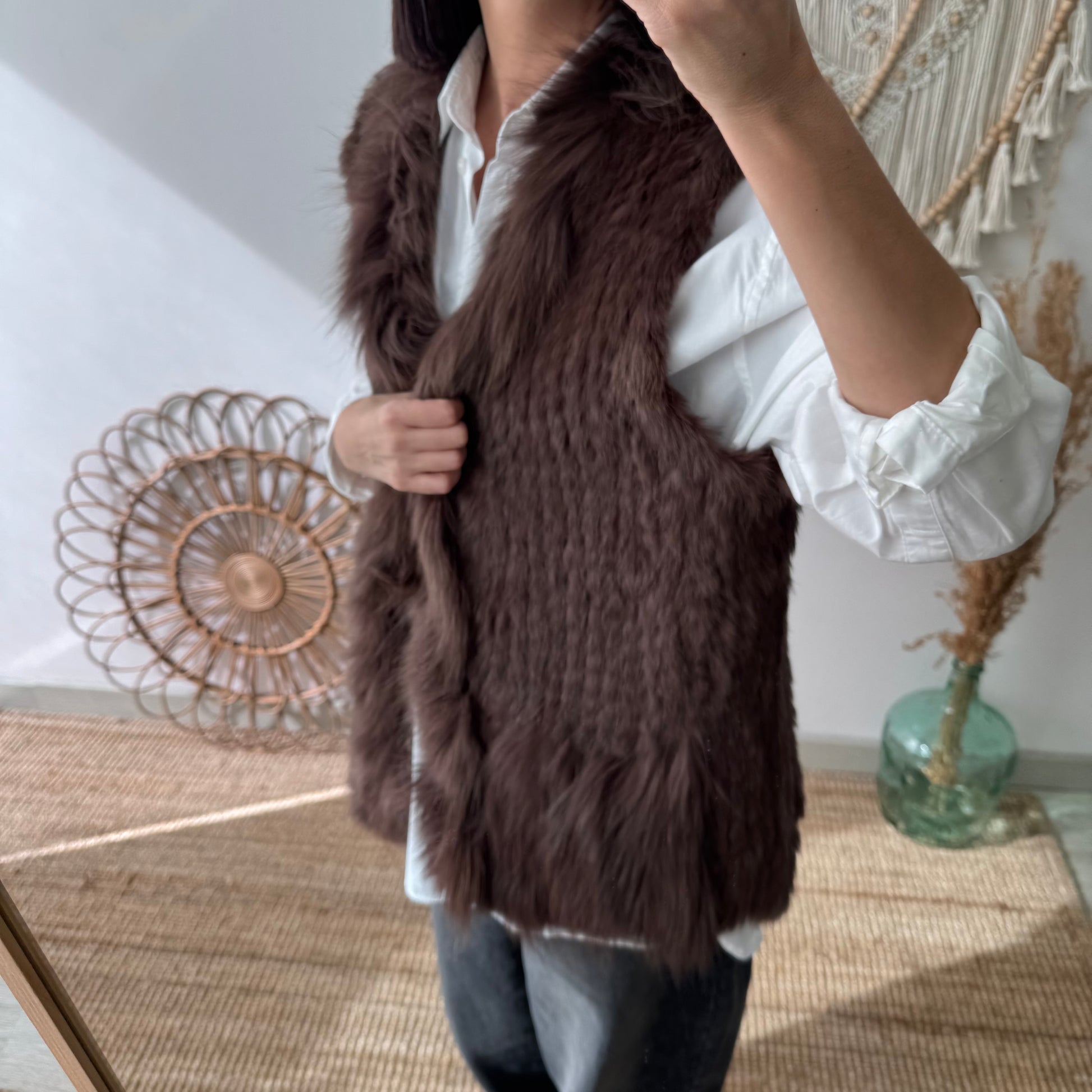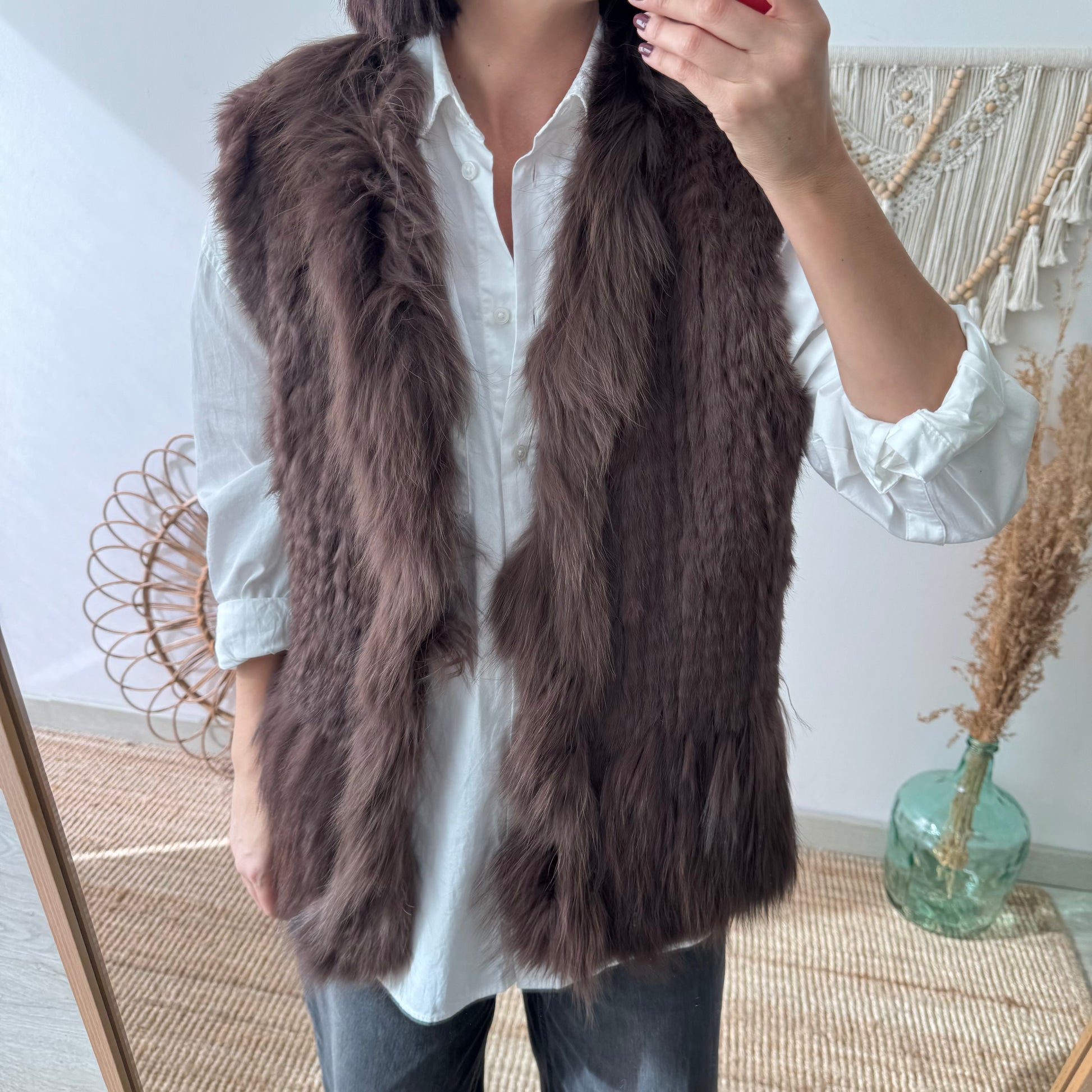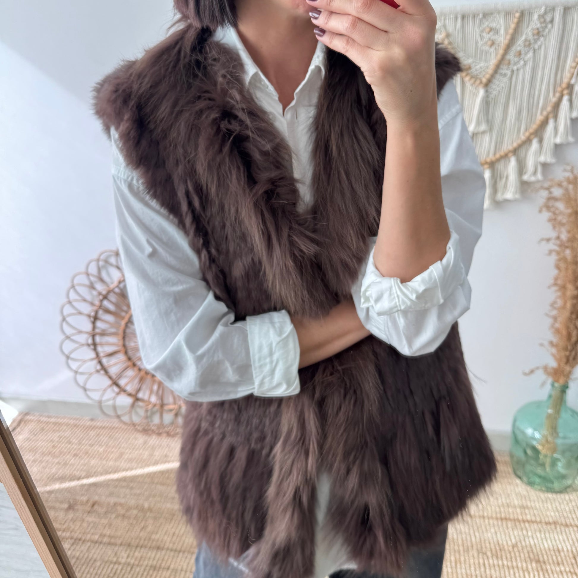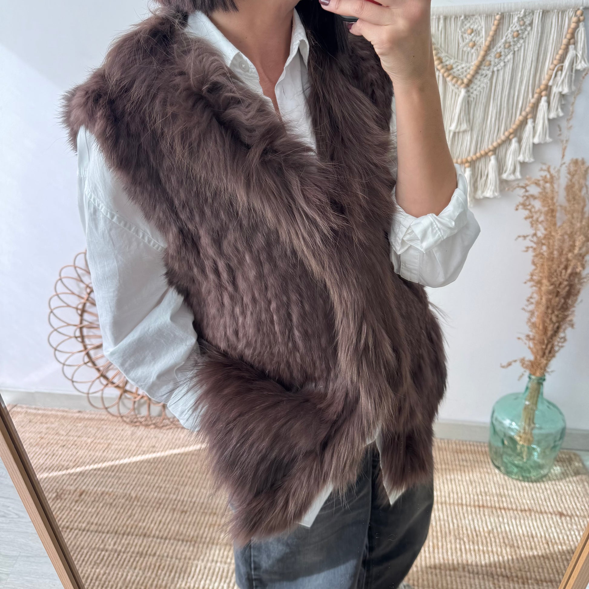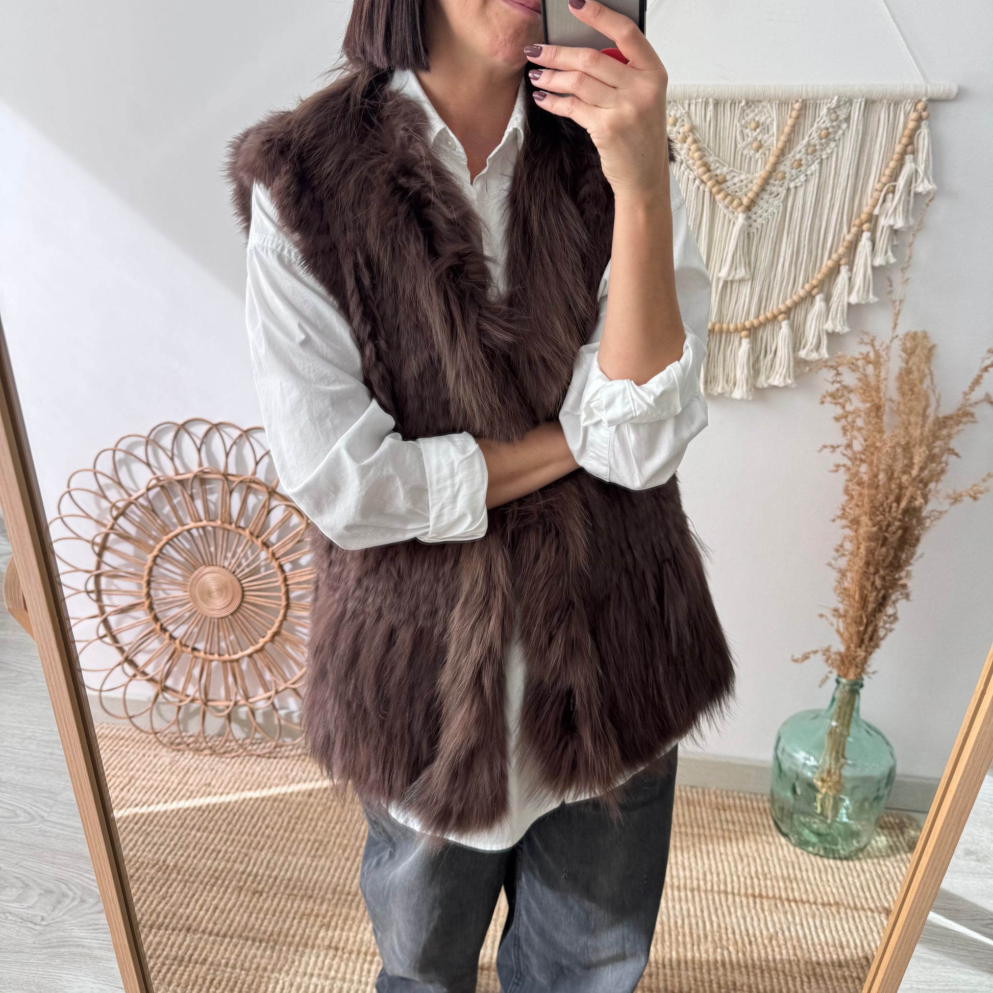 Un clásico reinventado para los días fríos. El chaleco de conejo y zorro natural – tono marrón combina suavidad, calidez y elegancia en una prenda que eleva cualquier look al instante. Su textura envolvente y el brillo sutil del pelo natural lo convierten en una pieza única, pensada para disfrutar del invierno con estilo.
