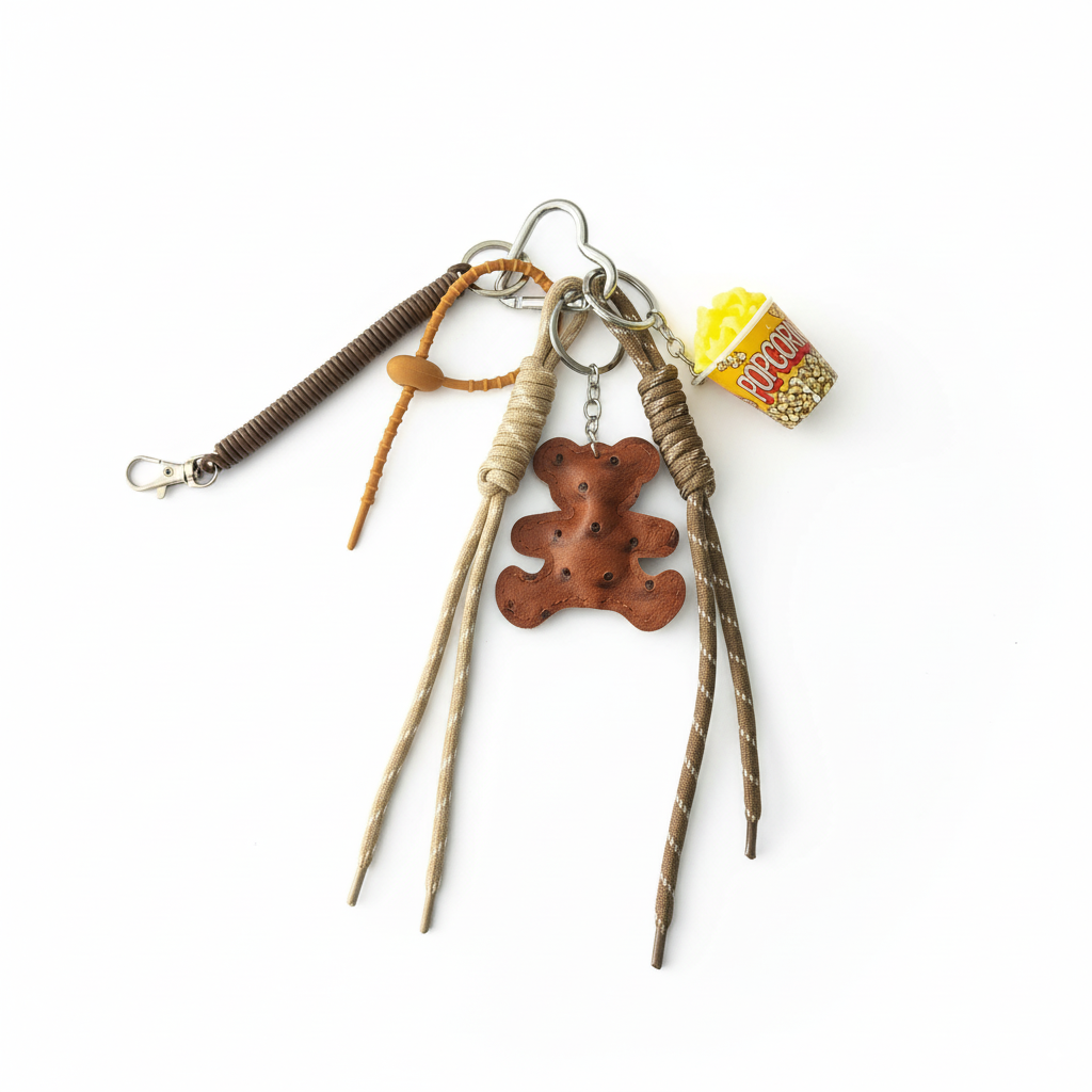 Dale un toque único a tu bolso con este encantador charm colgante, diseñado con una combinación de detalles que lo hacen irresistible. Incluye un tierno osito en acabado efecto cuero, cordones trenzados con estilo rústico, un simpático mini balde de palomitas y otros accesorios creativos que aportan personalidad y diversión.