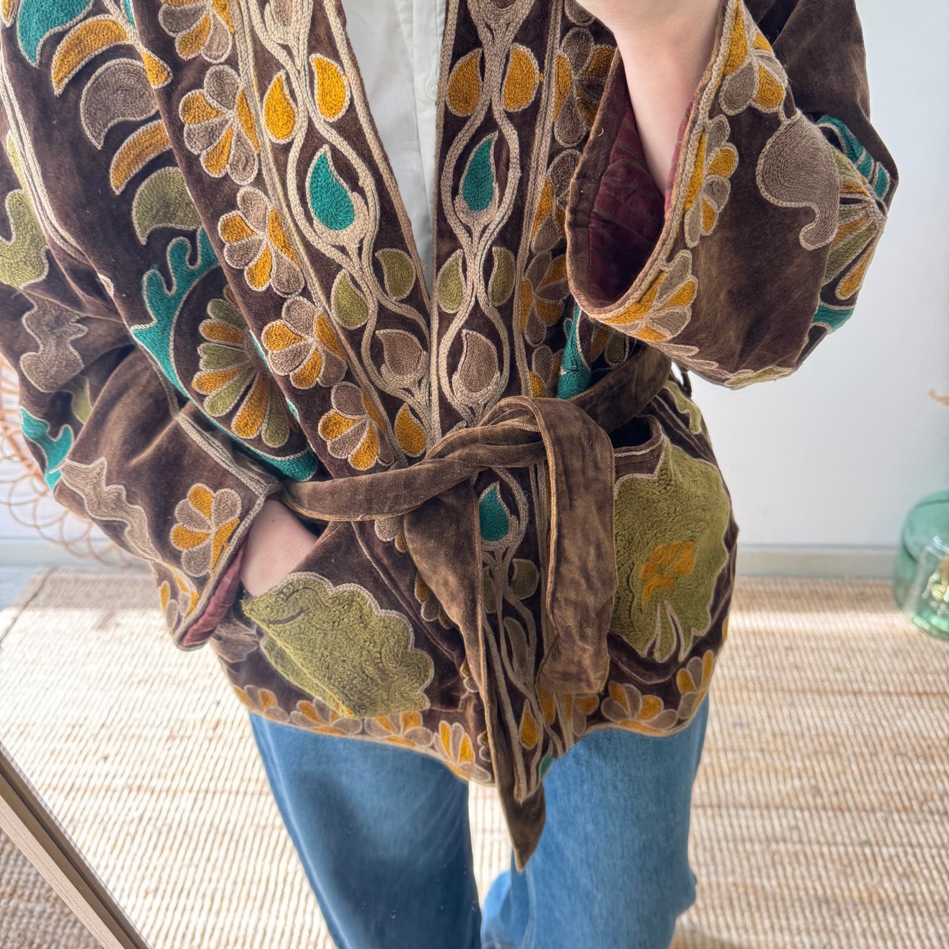 Hay piezas que cuentan una historia propia y este kimono es, sin duda, una de ellas. Confeccionada en un terciopelo marrón, destaca por su aire artístico y bohemio, ofreciendo esa elegancia relajada que eleva cualquier conjunto básico.