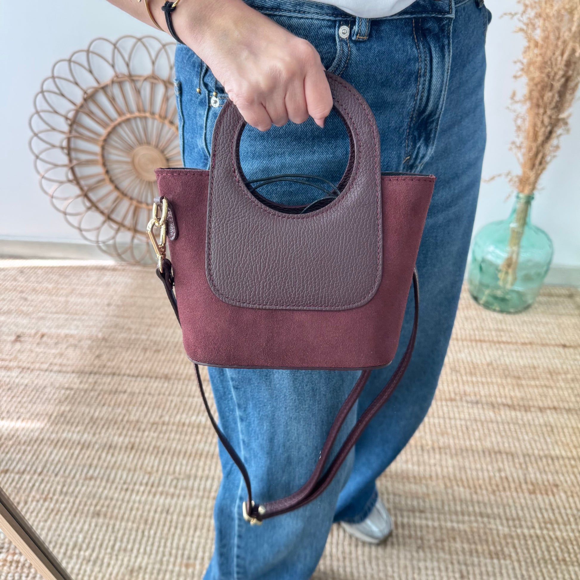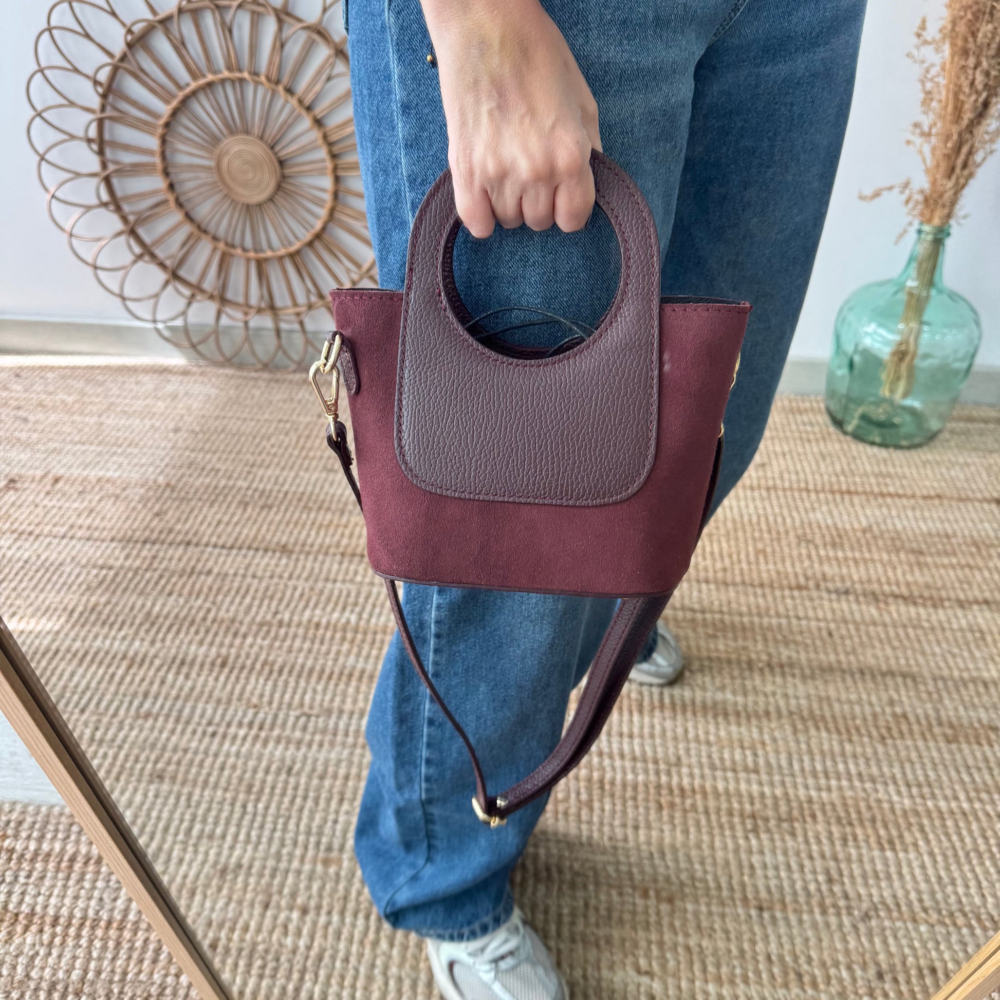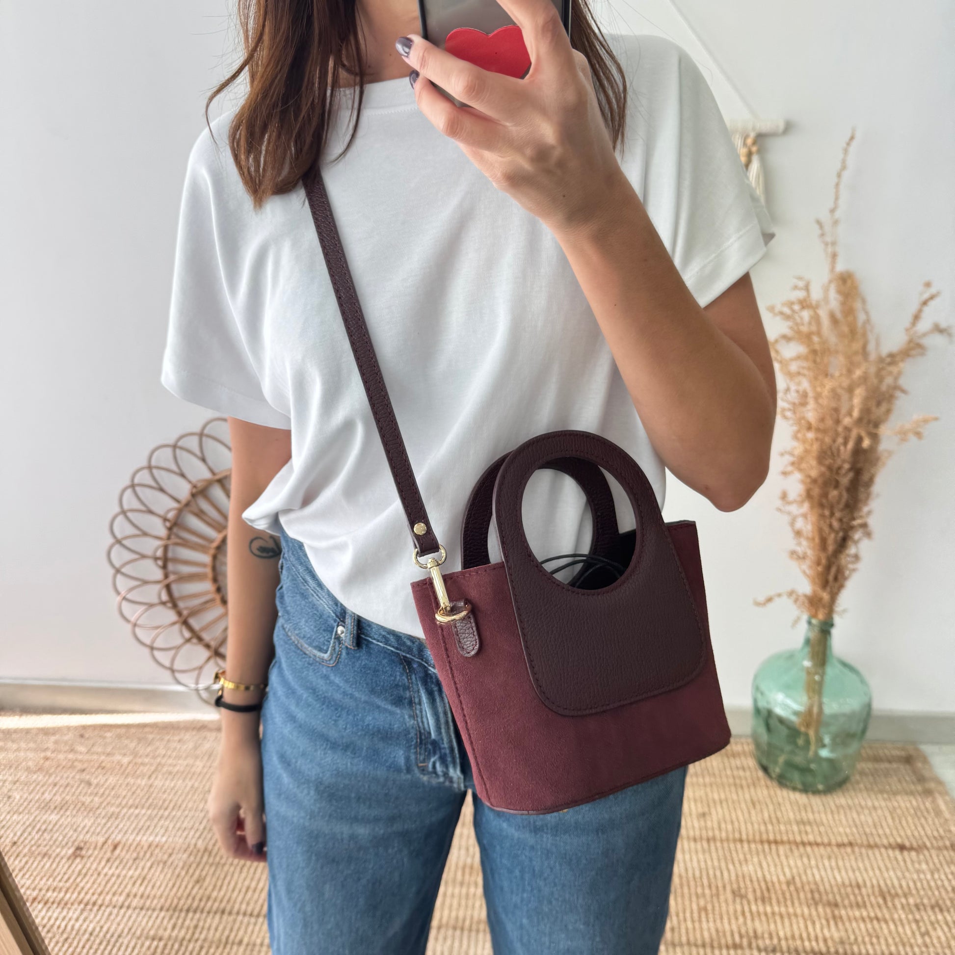 El Mini Tote circular en piel y serraje granate es un bolso único, elegante y versátil que destaca por su diseño contemporáneo con un toque sofisticado. Perfecto para elevar cualquier look, ya sea de día o de noche.