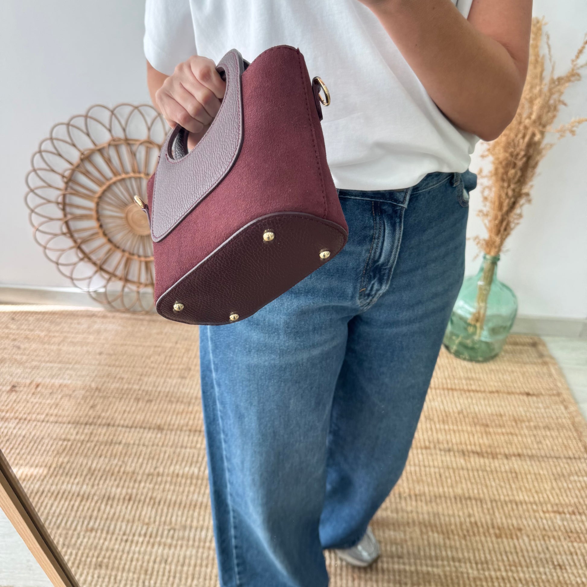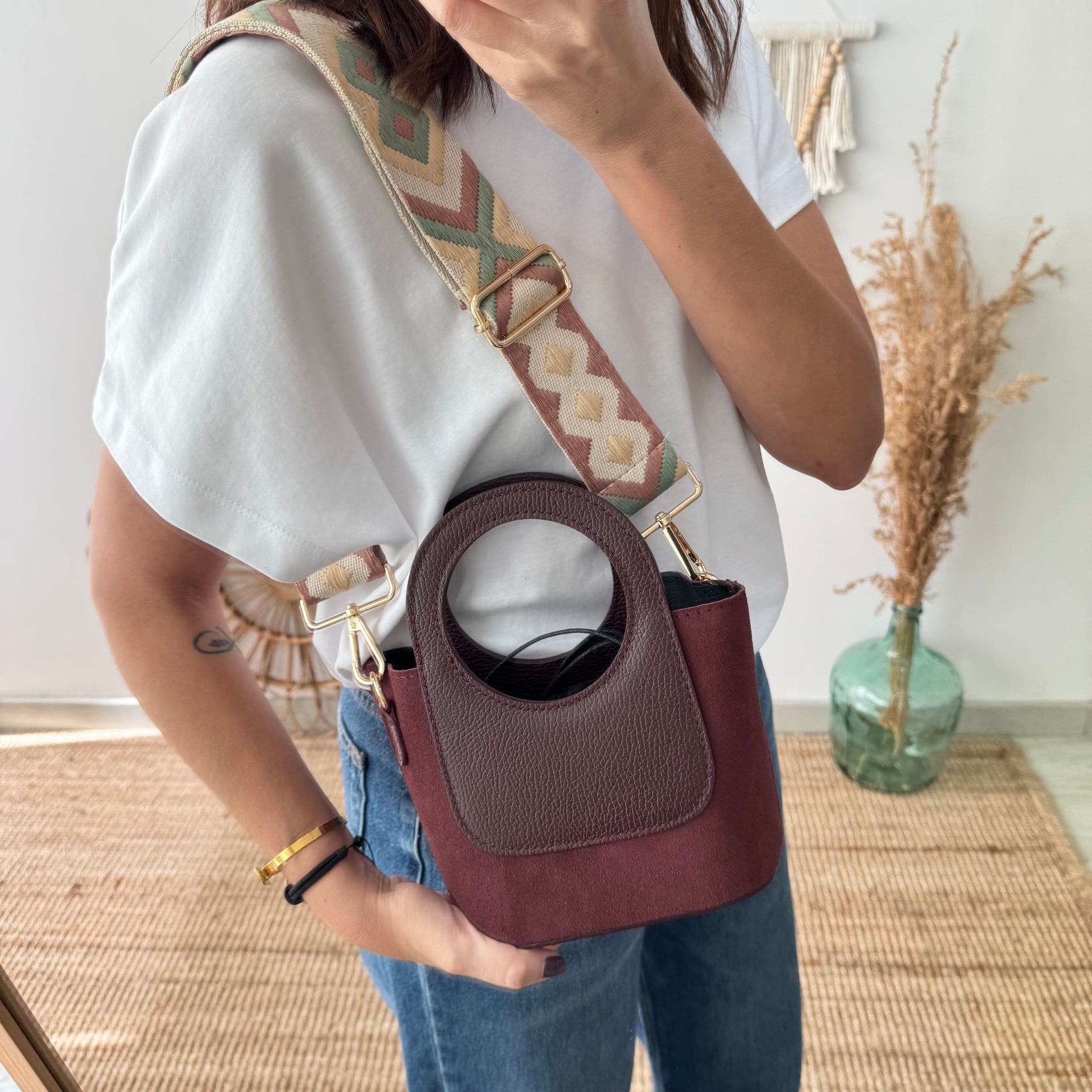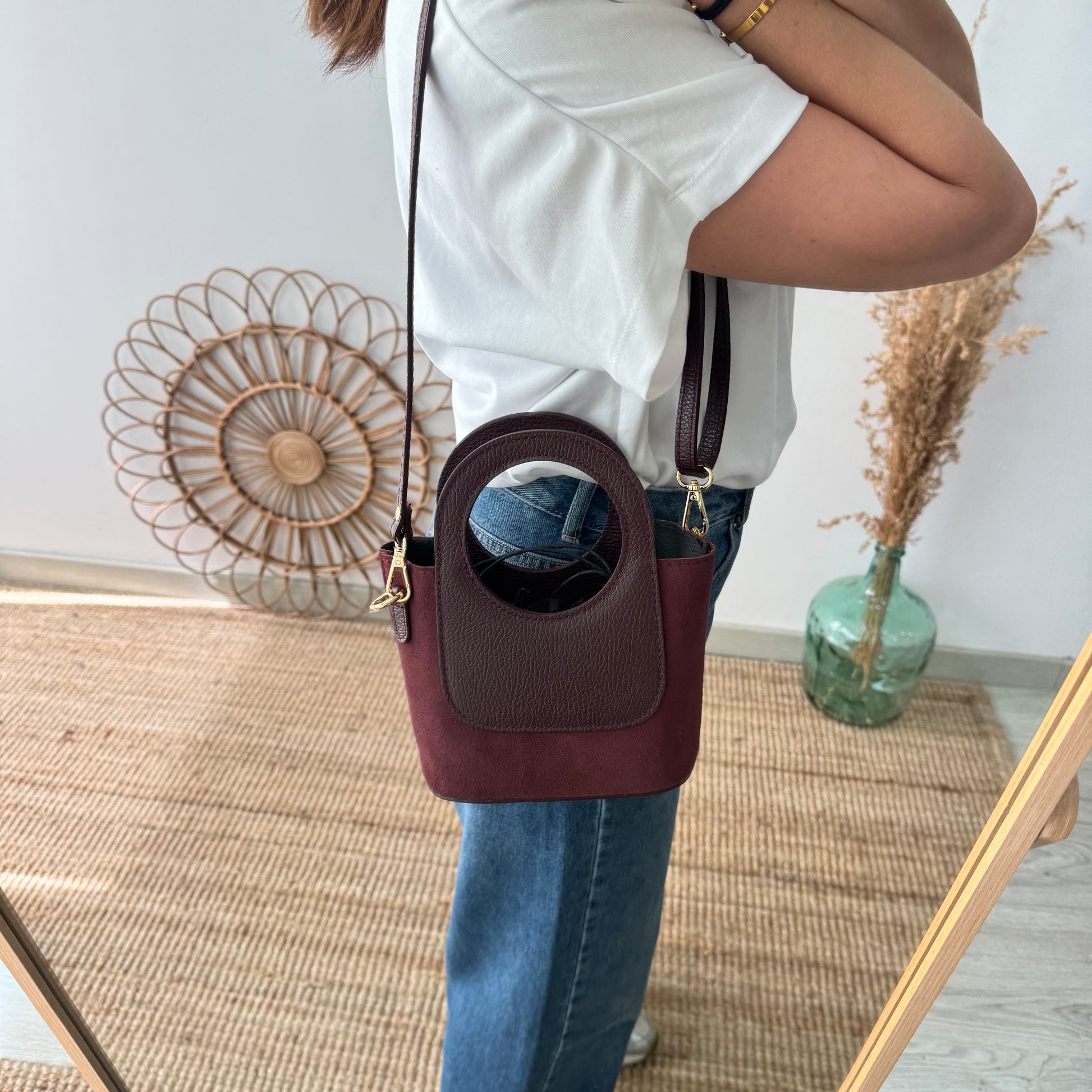 - Diseño exclusivo: confeccionado en piel y serraje granate, con un asa circular rígida que lo convierte en una pieza diferente y estilosa.