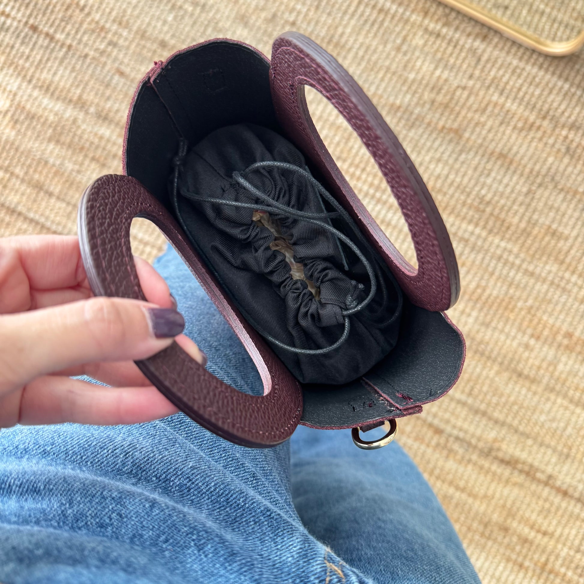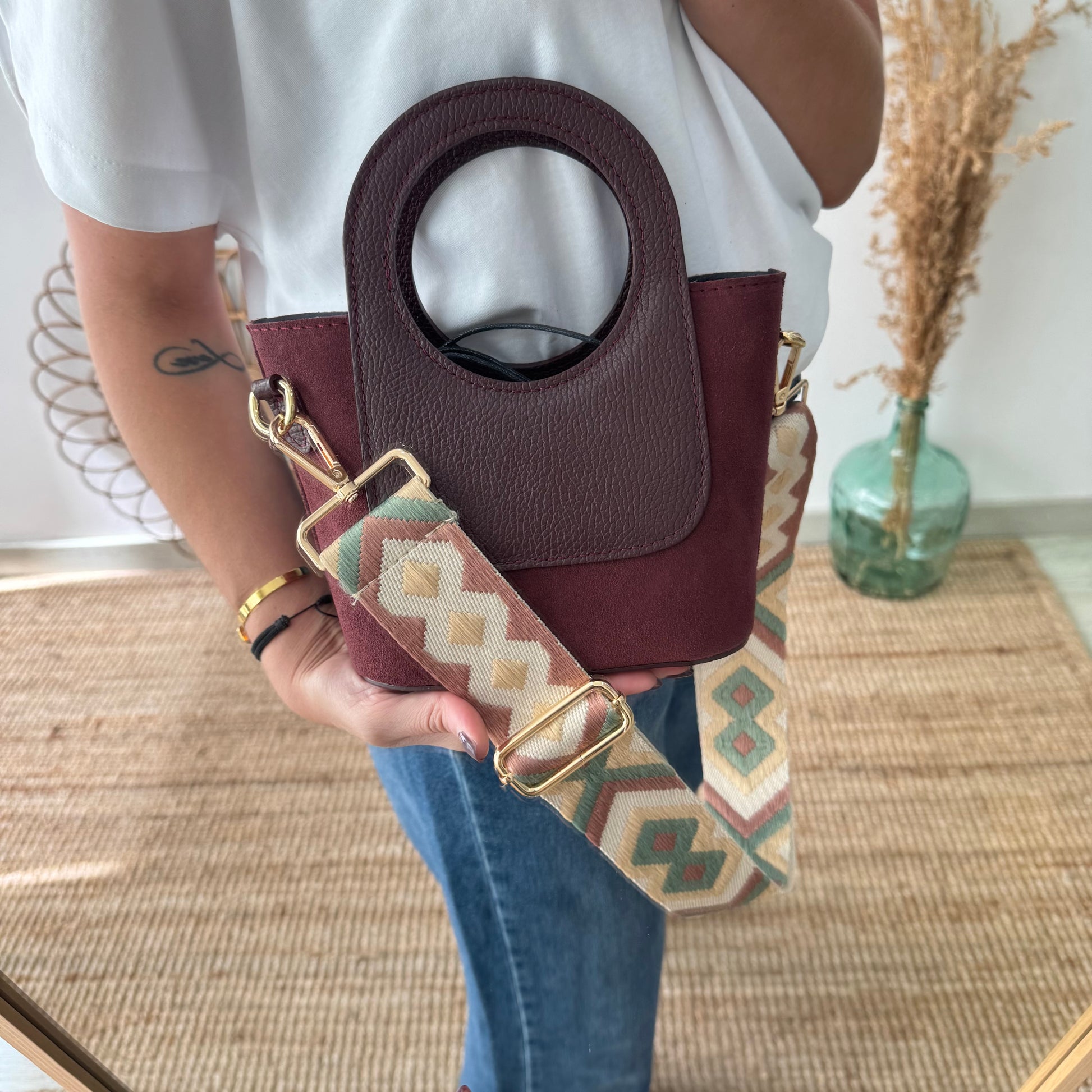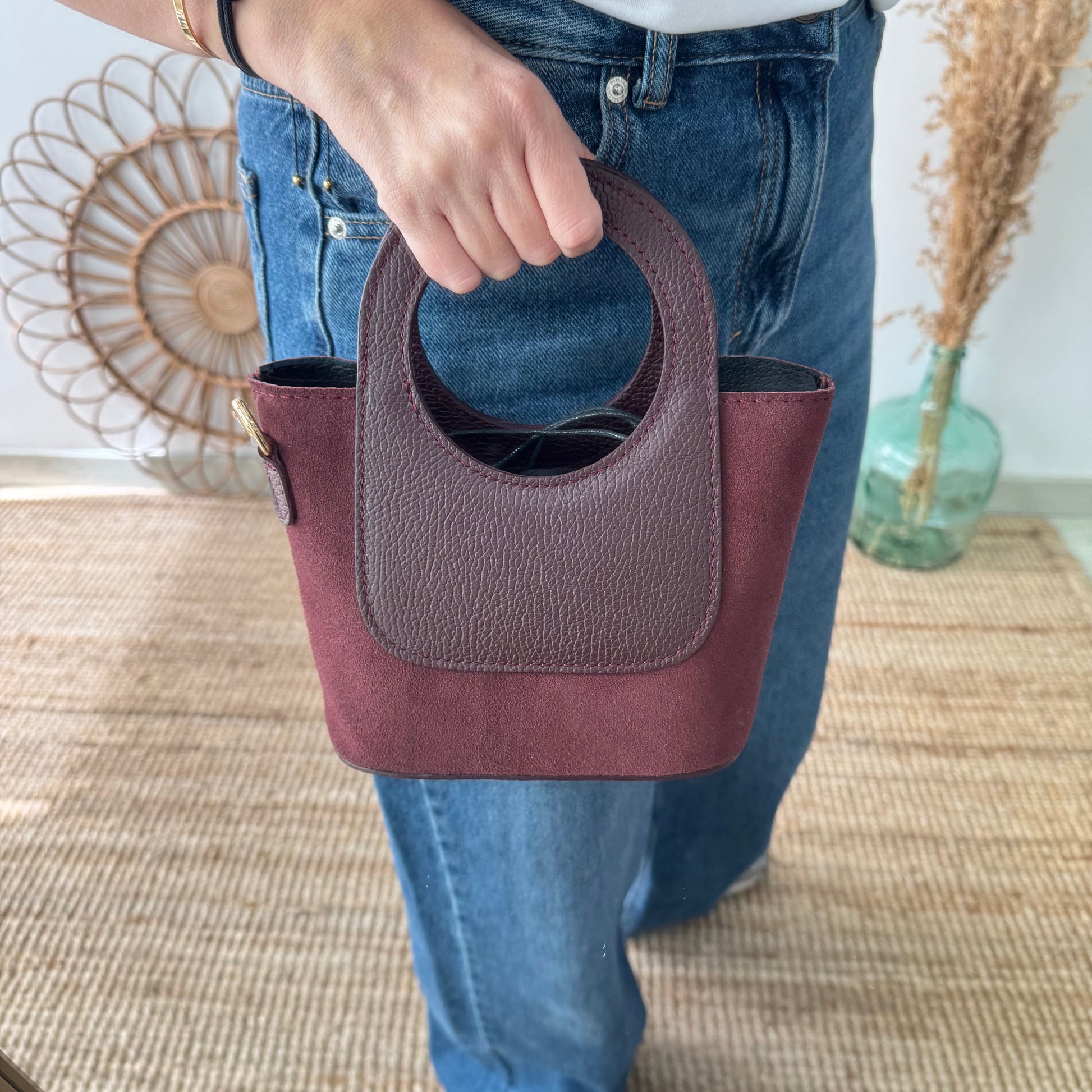 - Diseño exclusivo: confeccionado en piel y serraje granate, con un asa circular rígida que lo convierte en una pieza diferente y estilosa.