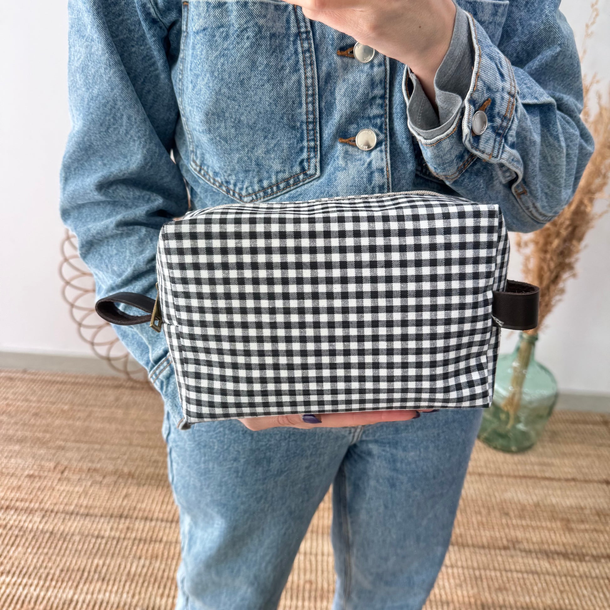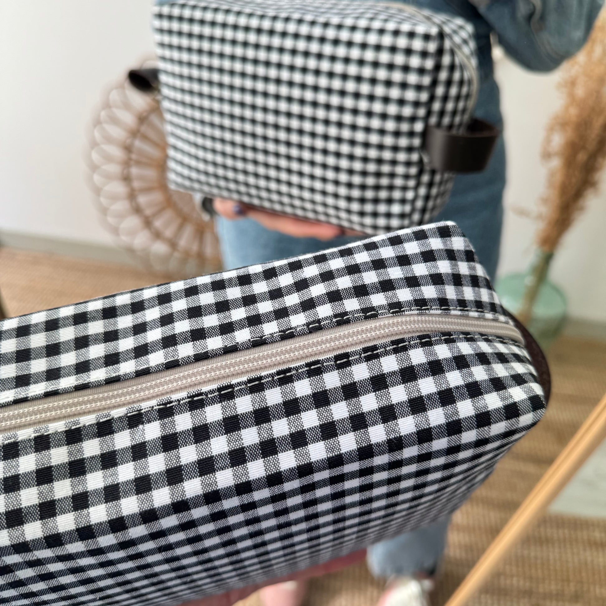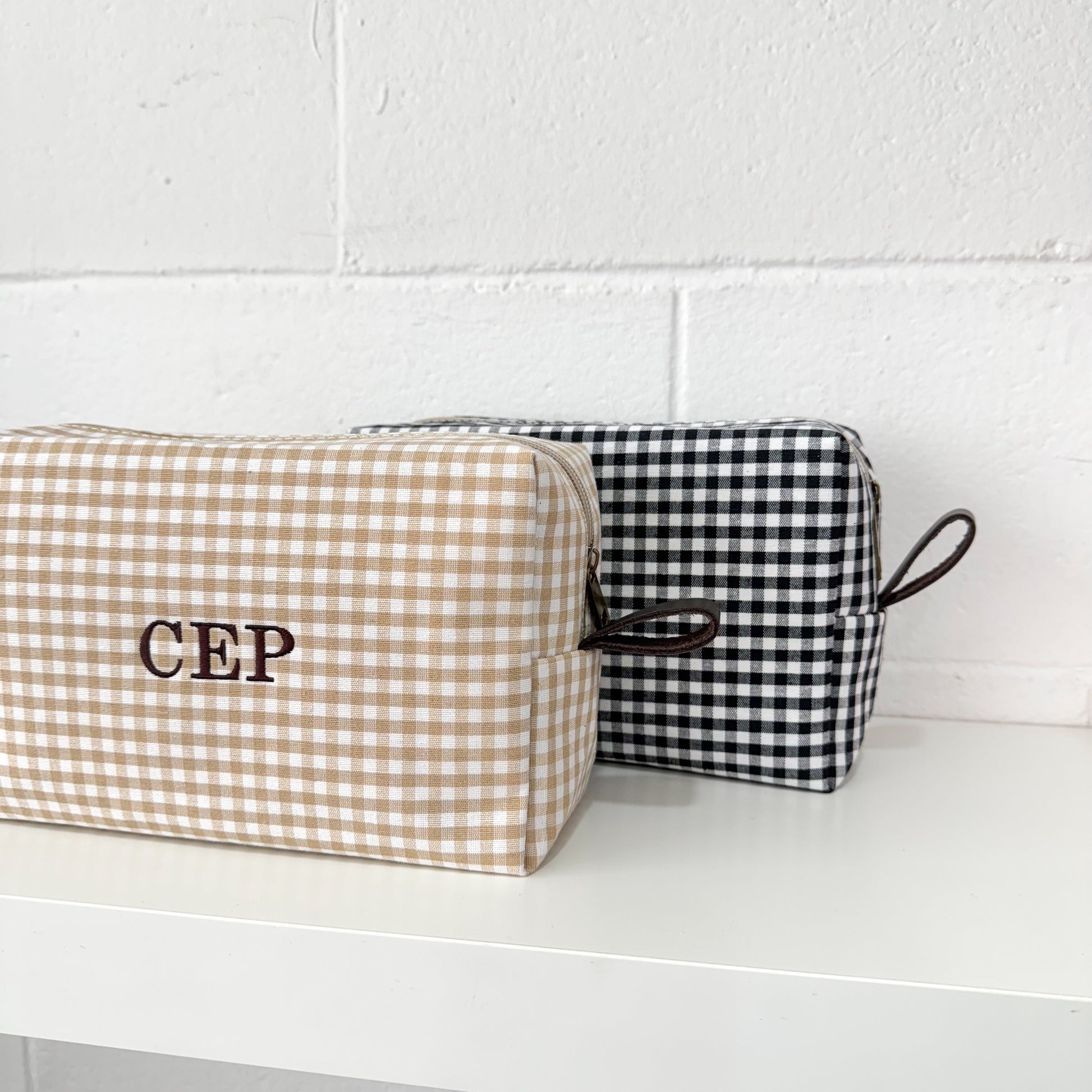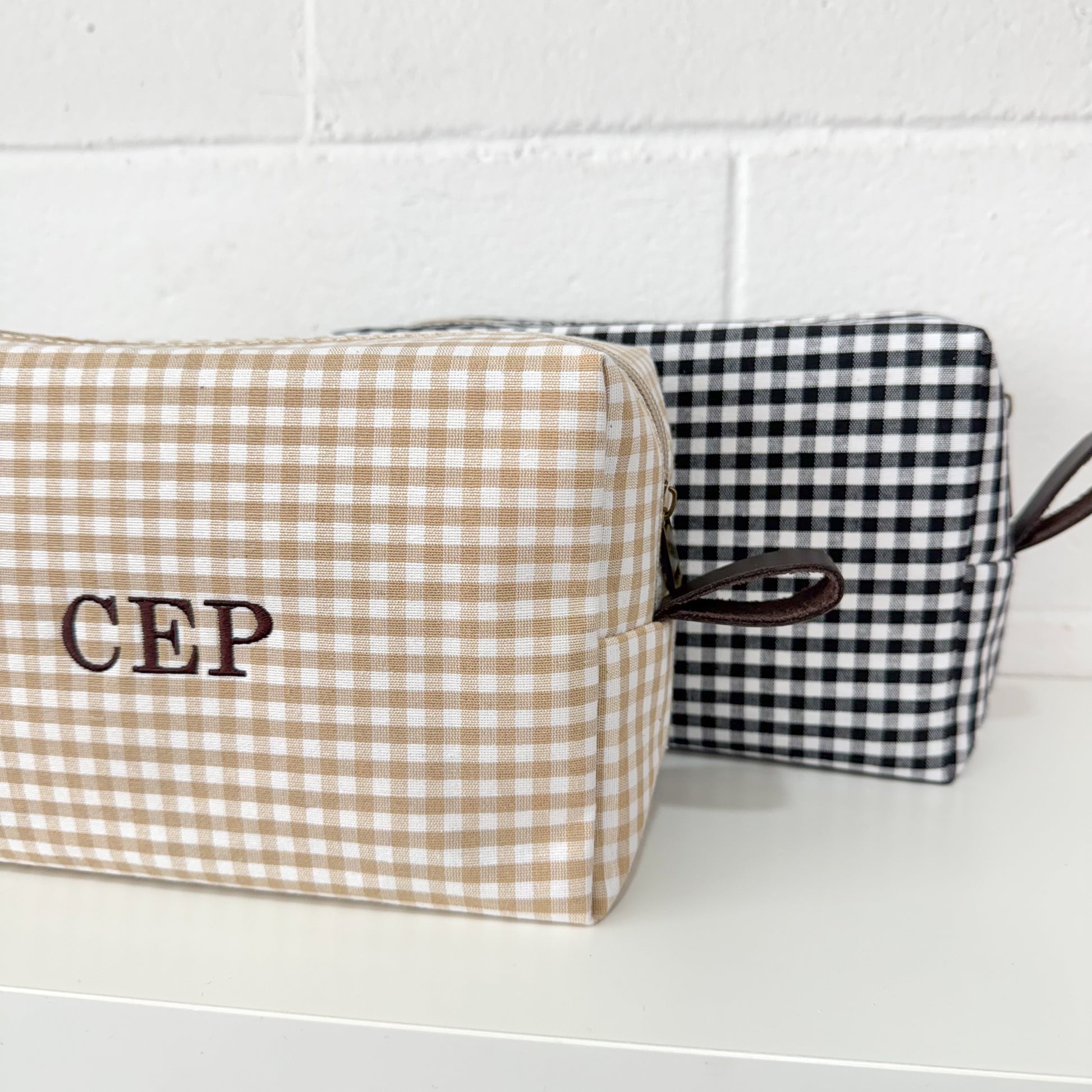 Neceser combinado algodon y piel cuadros vichy negro iniciales bordadas