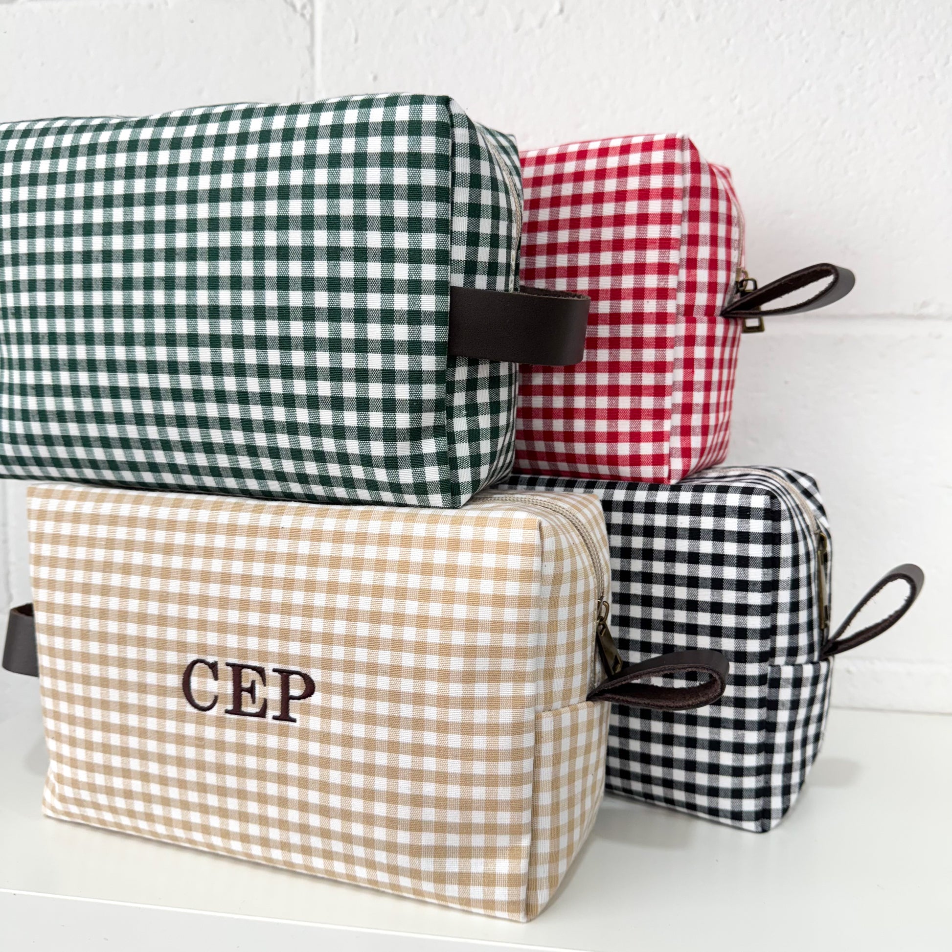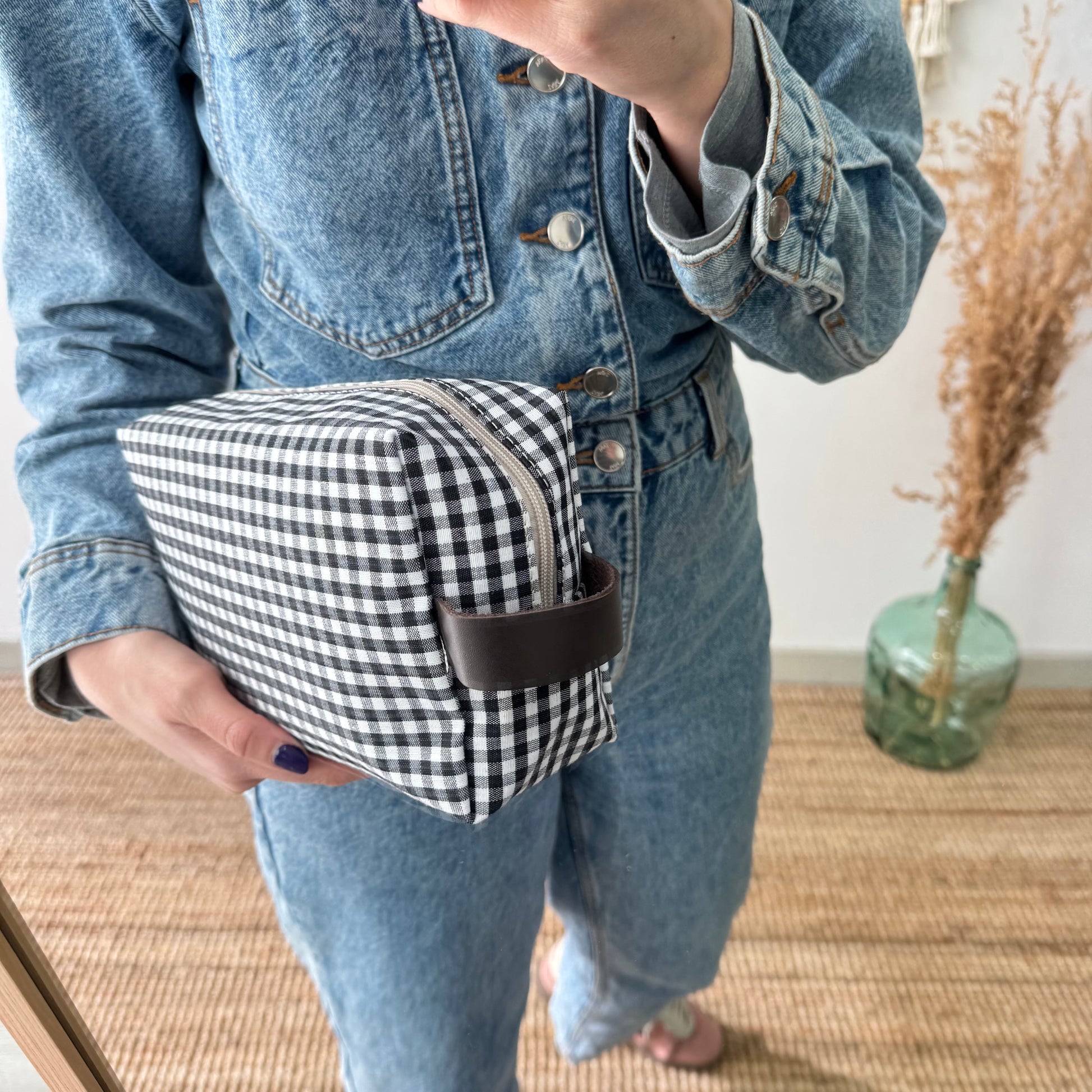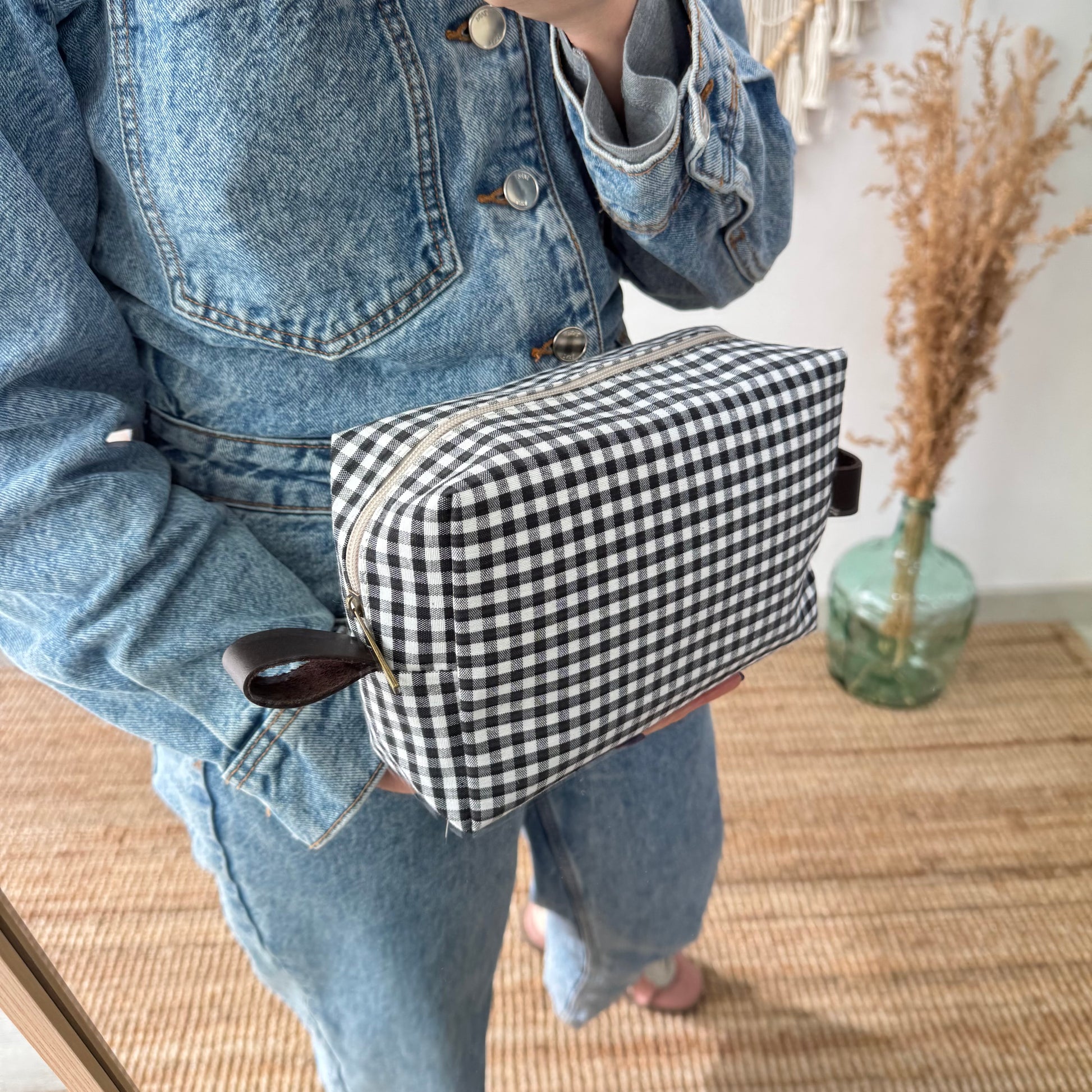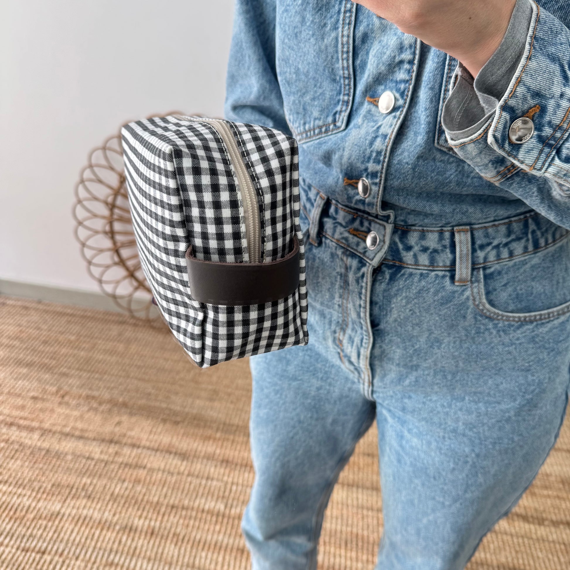 Neceser combinado algodon y piel cuadros vichy negro iniciales bordadas