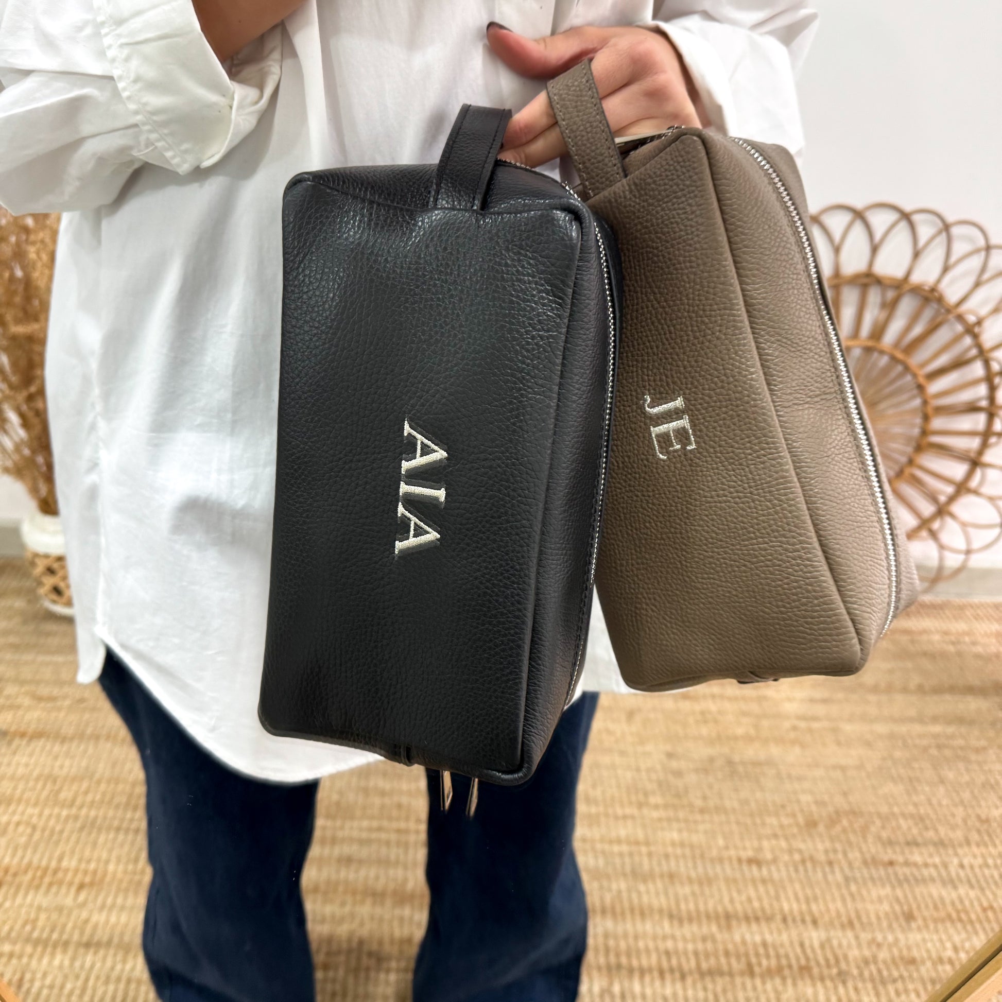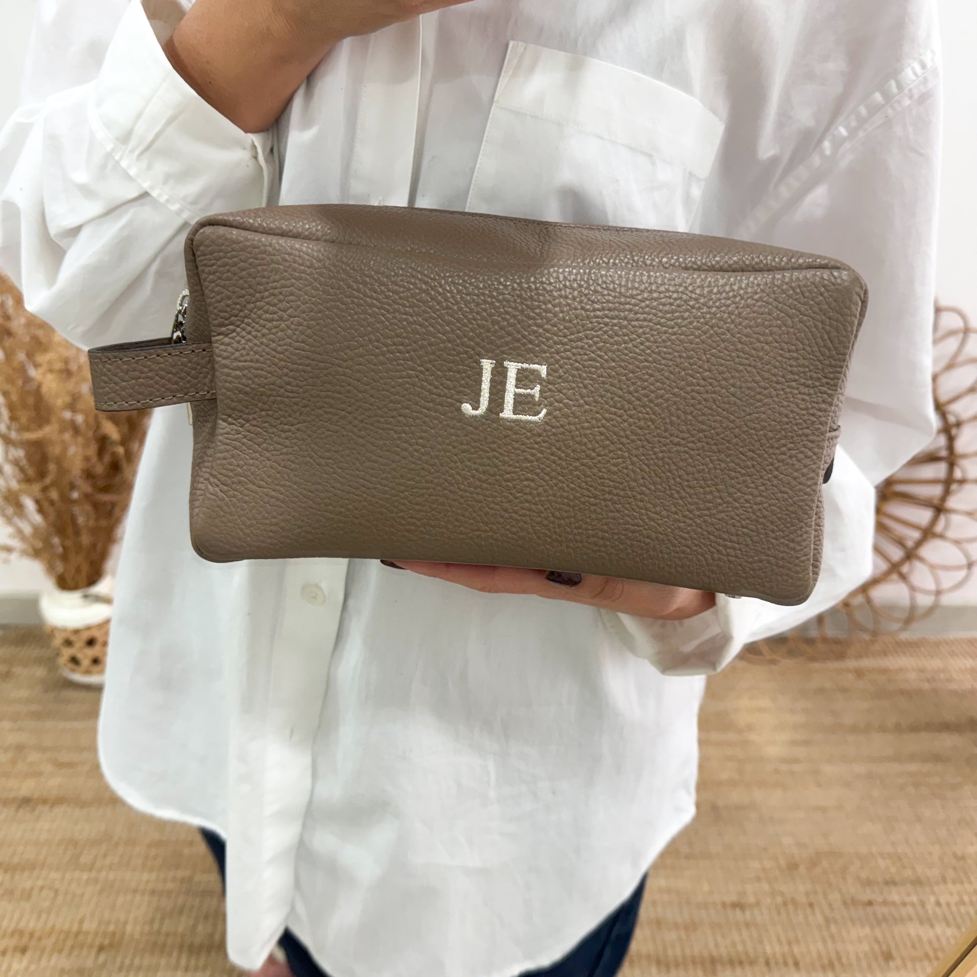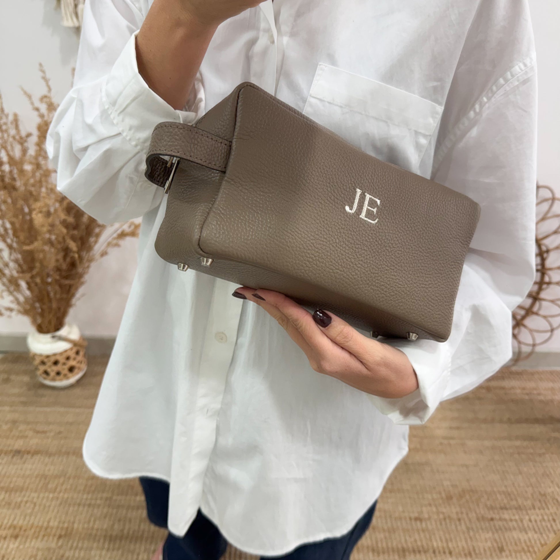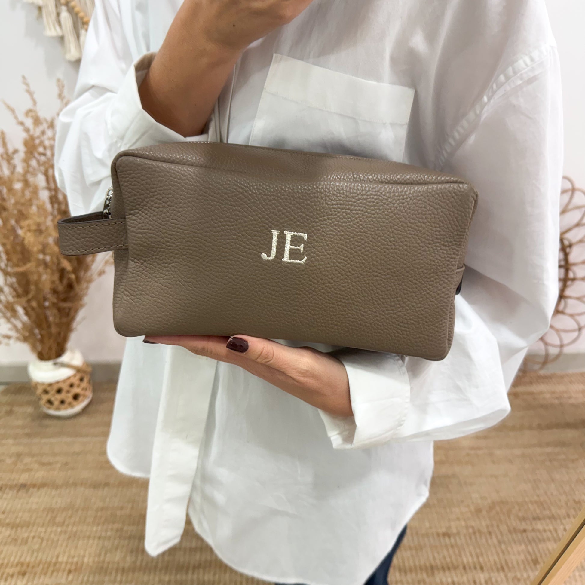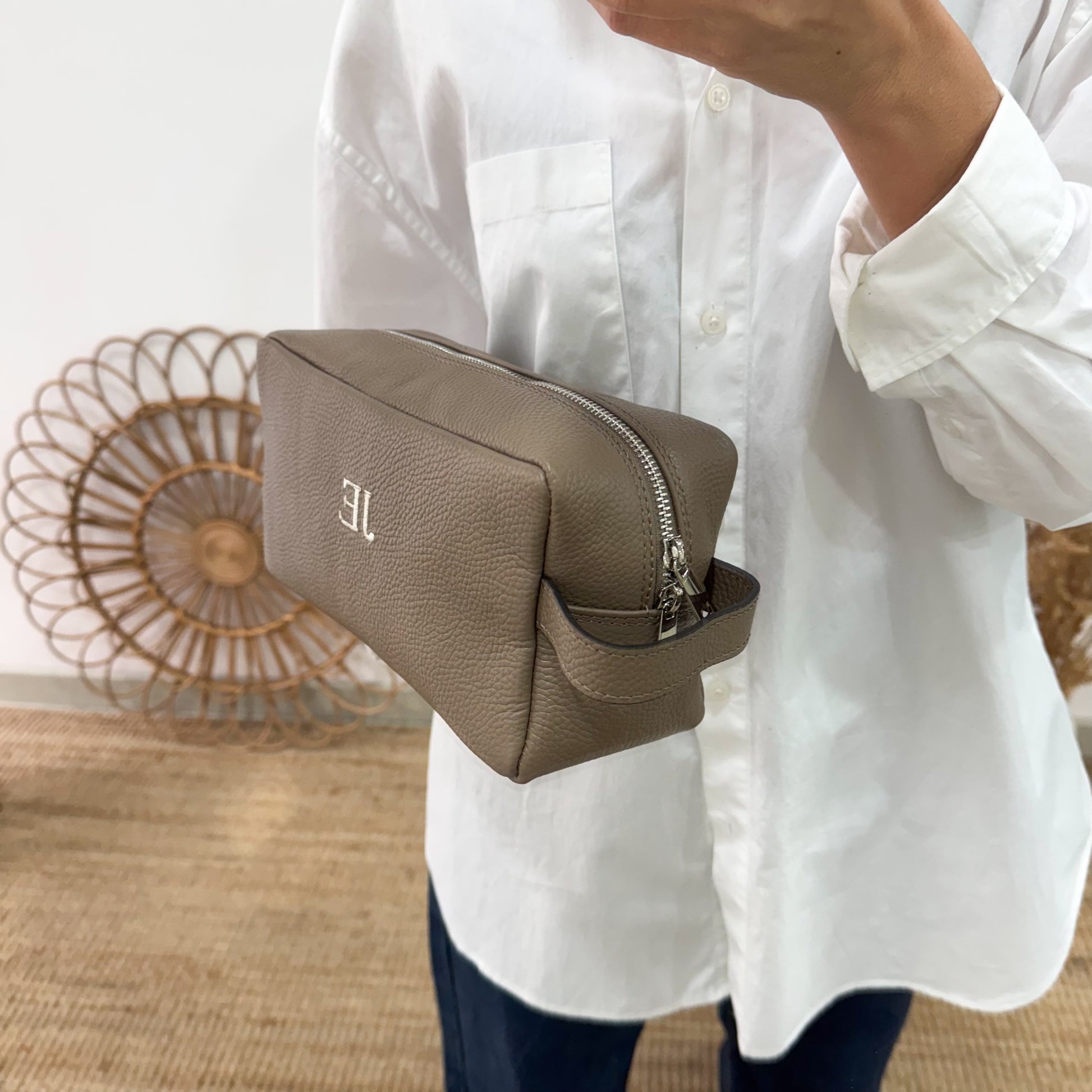 El neceser de viaje de piel en color taupe con asa en uno de los lados.