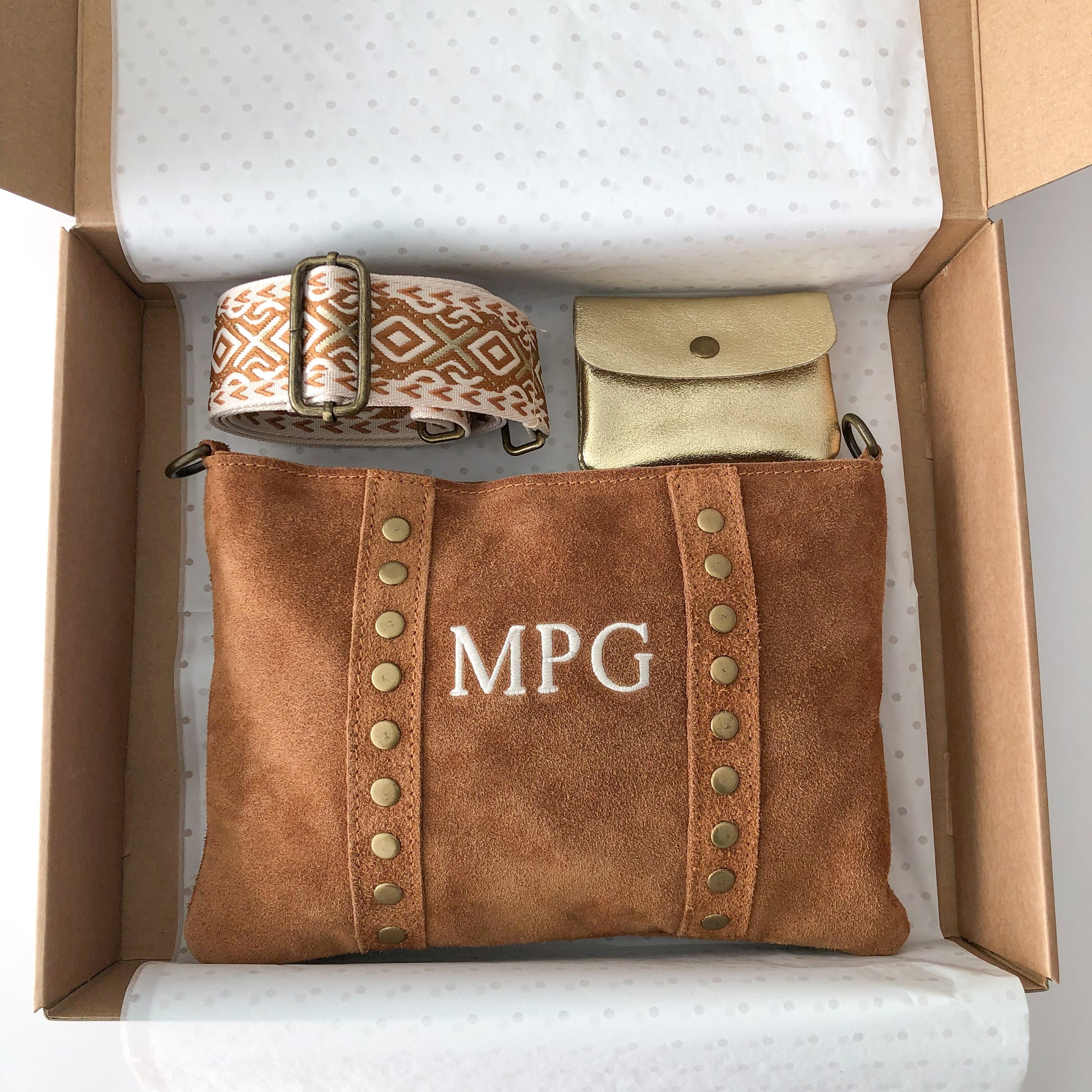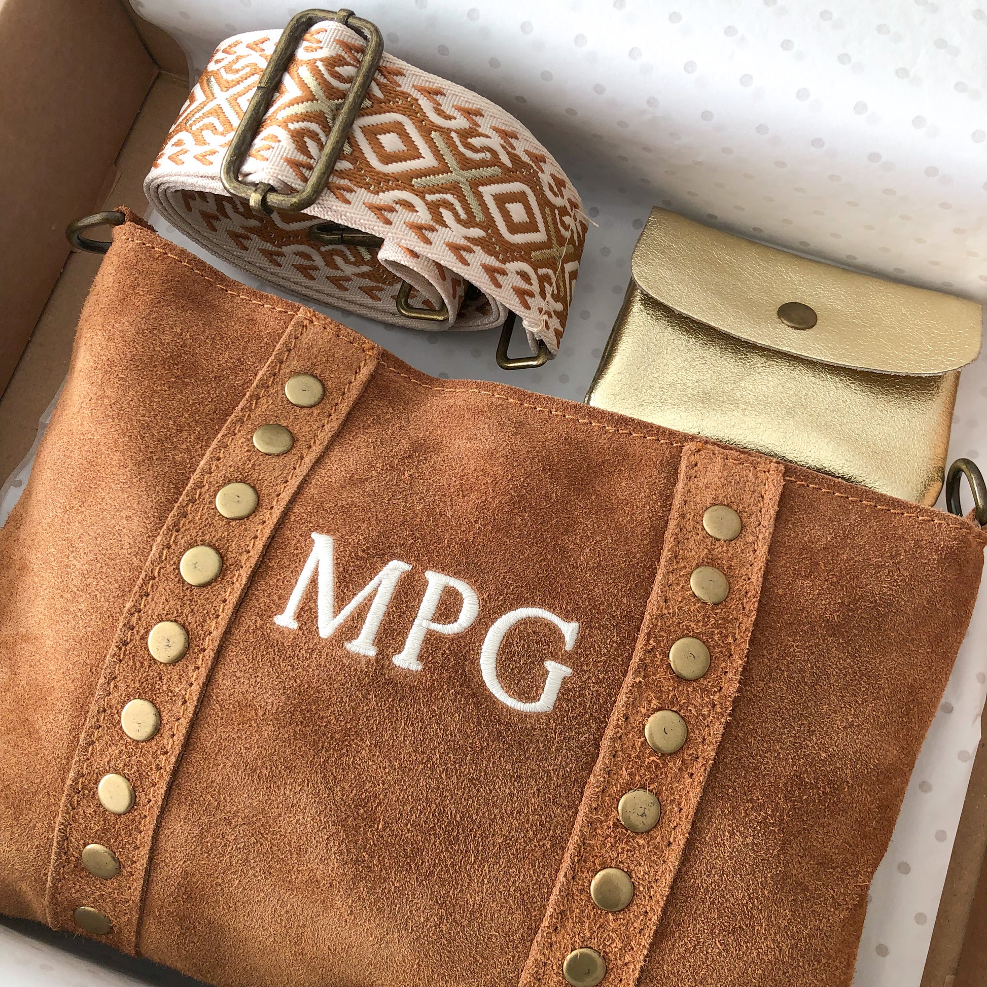 PACK REGALO BANDOLERA TACHUELAS ANTE CAMEL PERSONALIZADO
