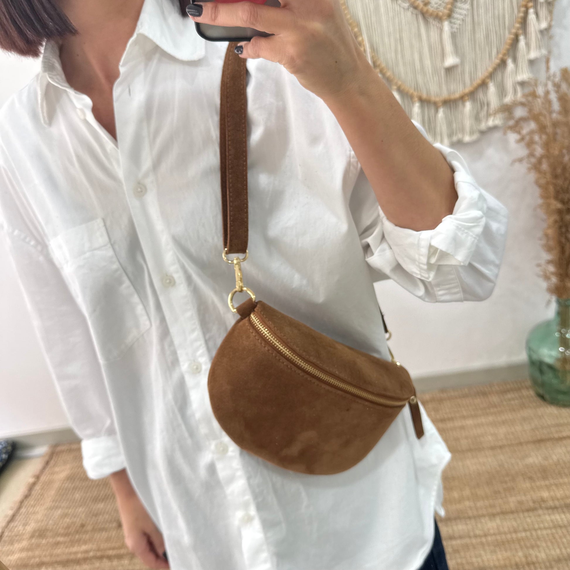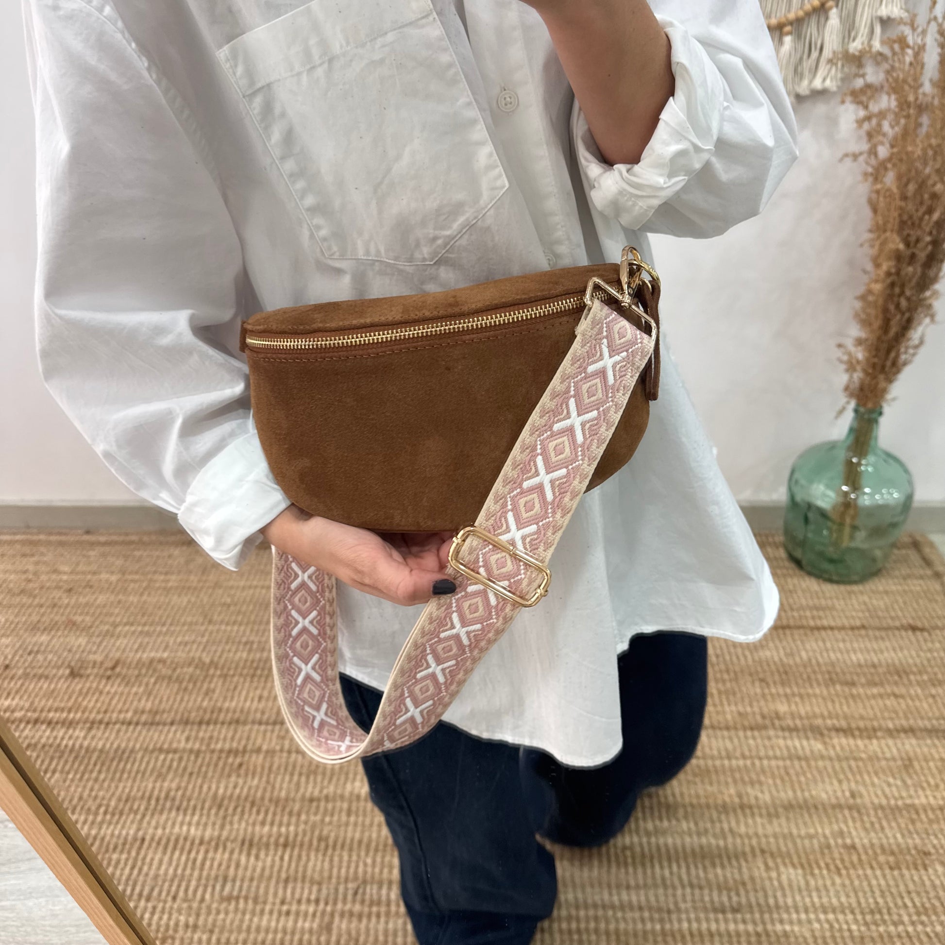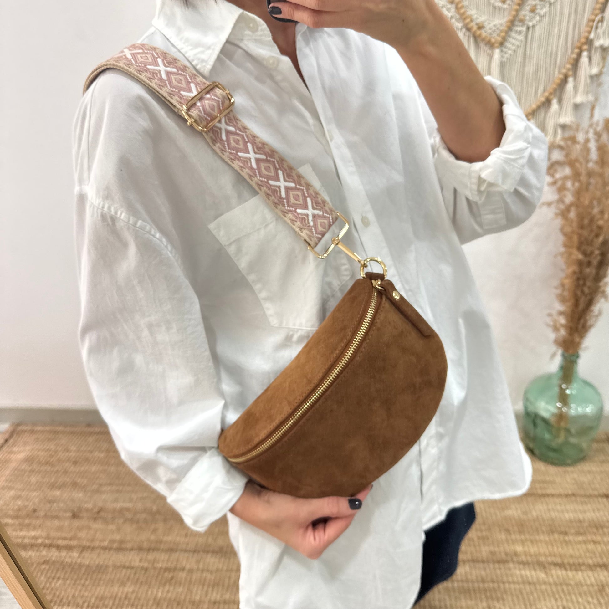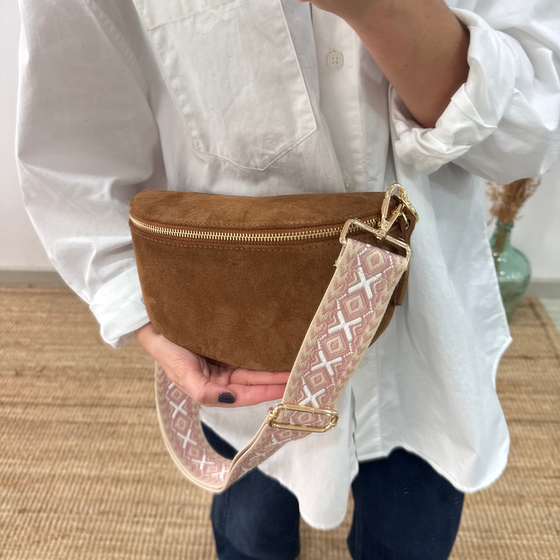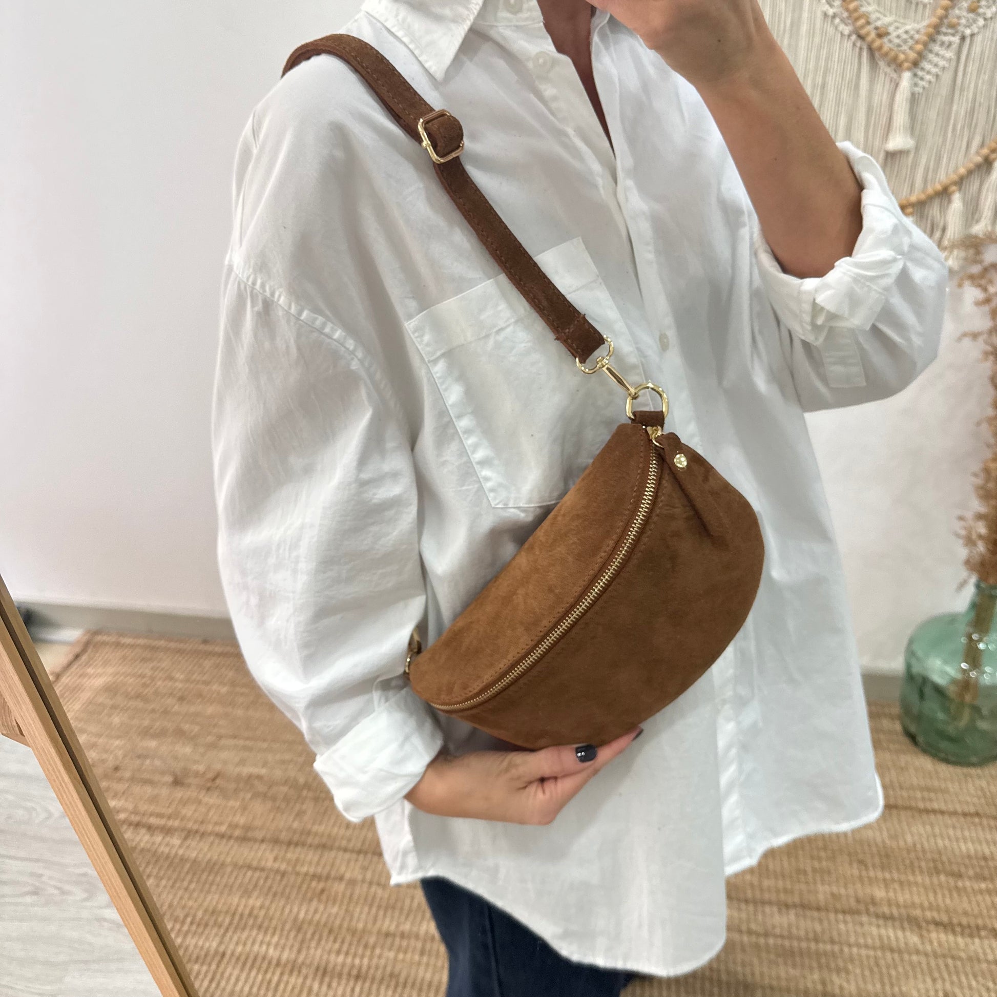 Nuestra riñonera/bandolera de piel, en color camel. La tendencia estrella de esta temporada, ponte la cruzada al hombro a modo de bolso o alrededor de la cintura y si le añades una correa étnica llevarás tu riñonera a otro nivel.