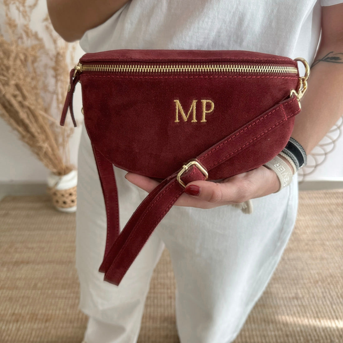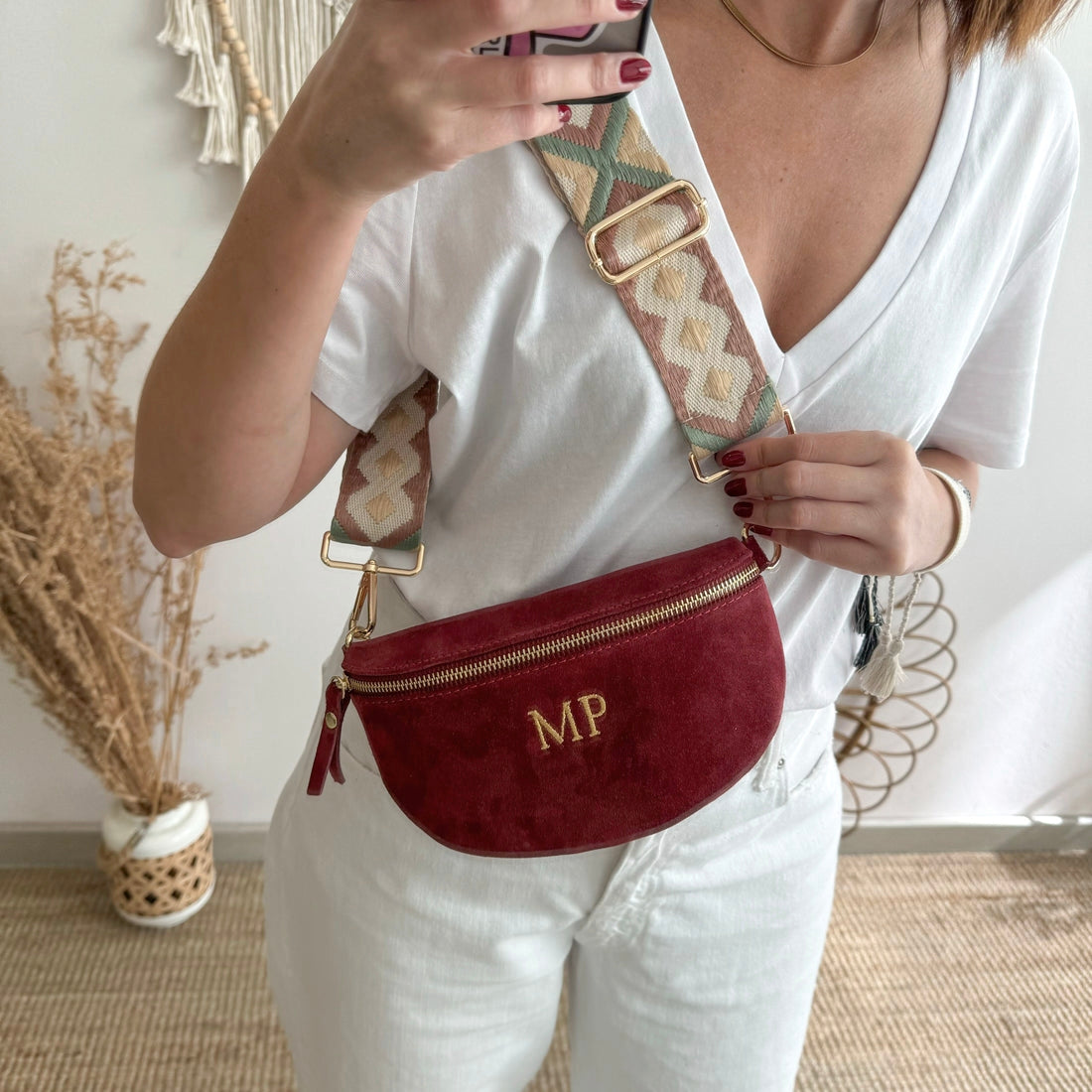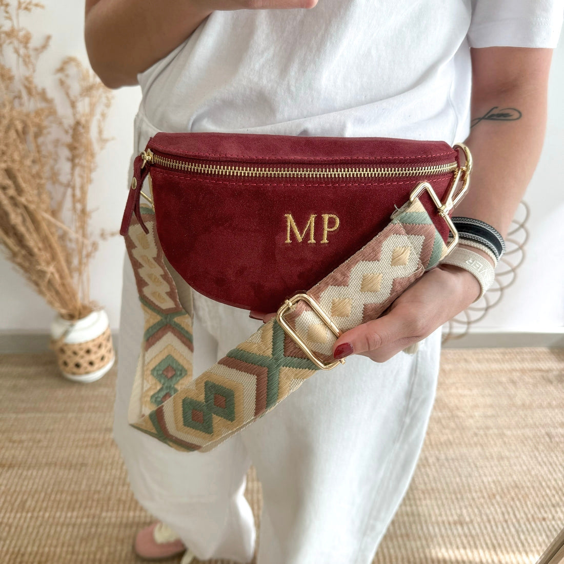 Riñonera/bandolera serraje granate iniciales bordadas correa étnica