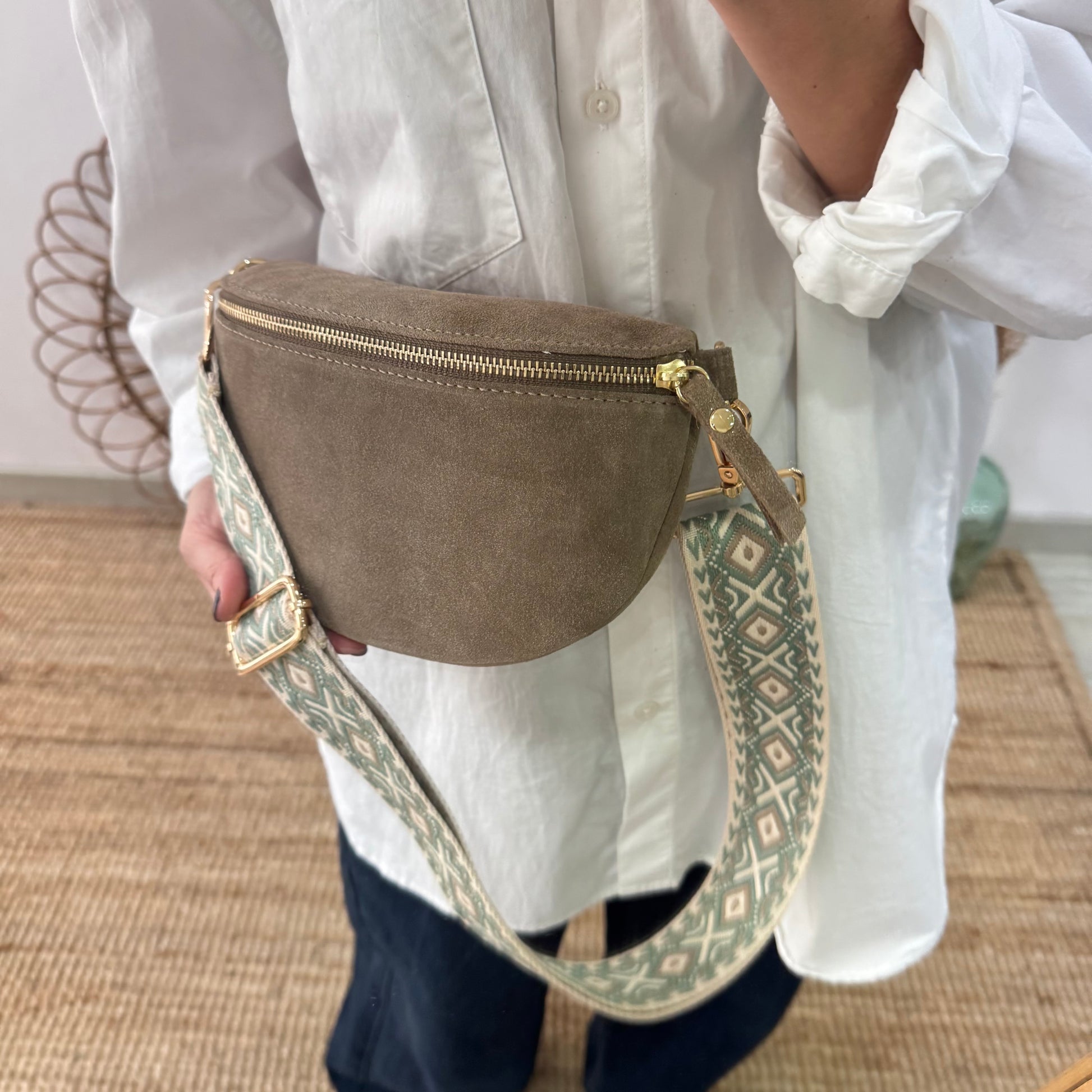 Riñonera/bandolera serraje taupe herrajes dorados iniciales bordadas