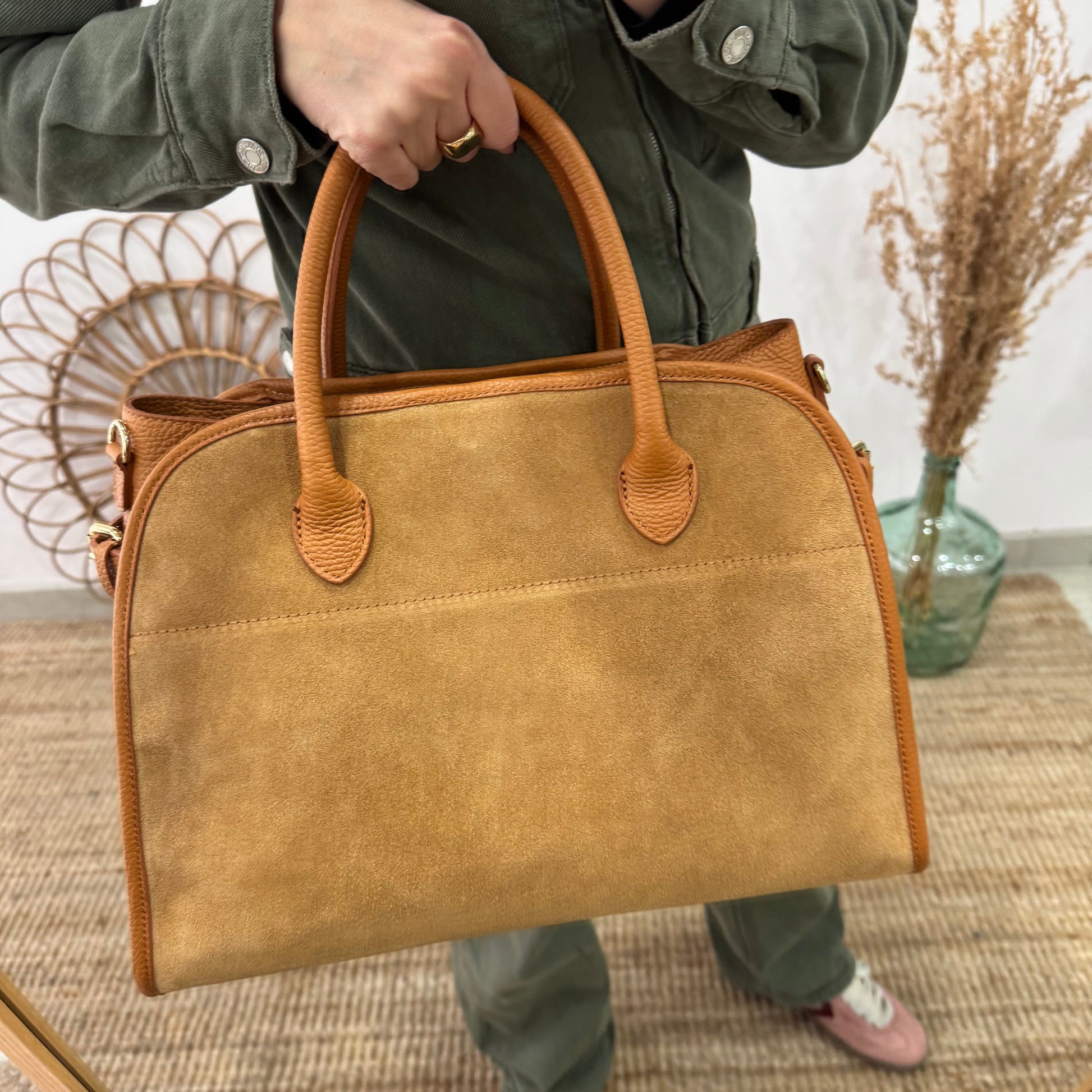 Nuestro bolso shopper con asas de mano en piel de color camel para llevarlo con estilo. Tiene una combinación de piel y serraje, la parte delantera y posterior es de serraje y el resto es de piel.