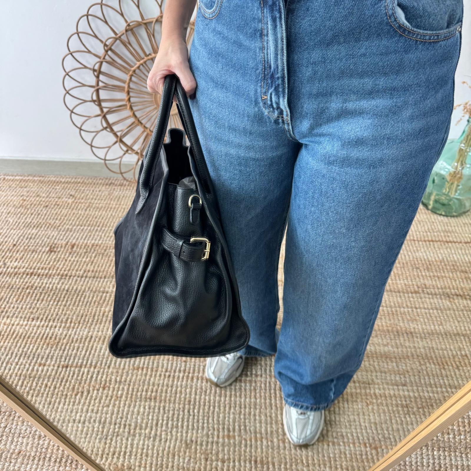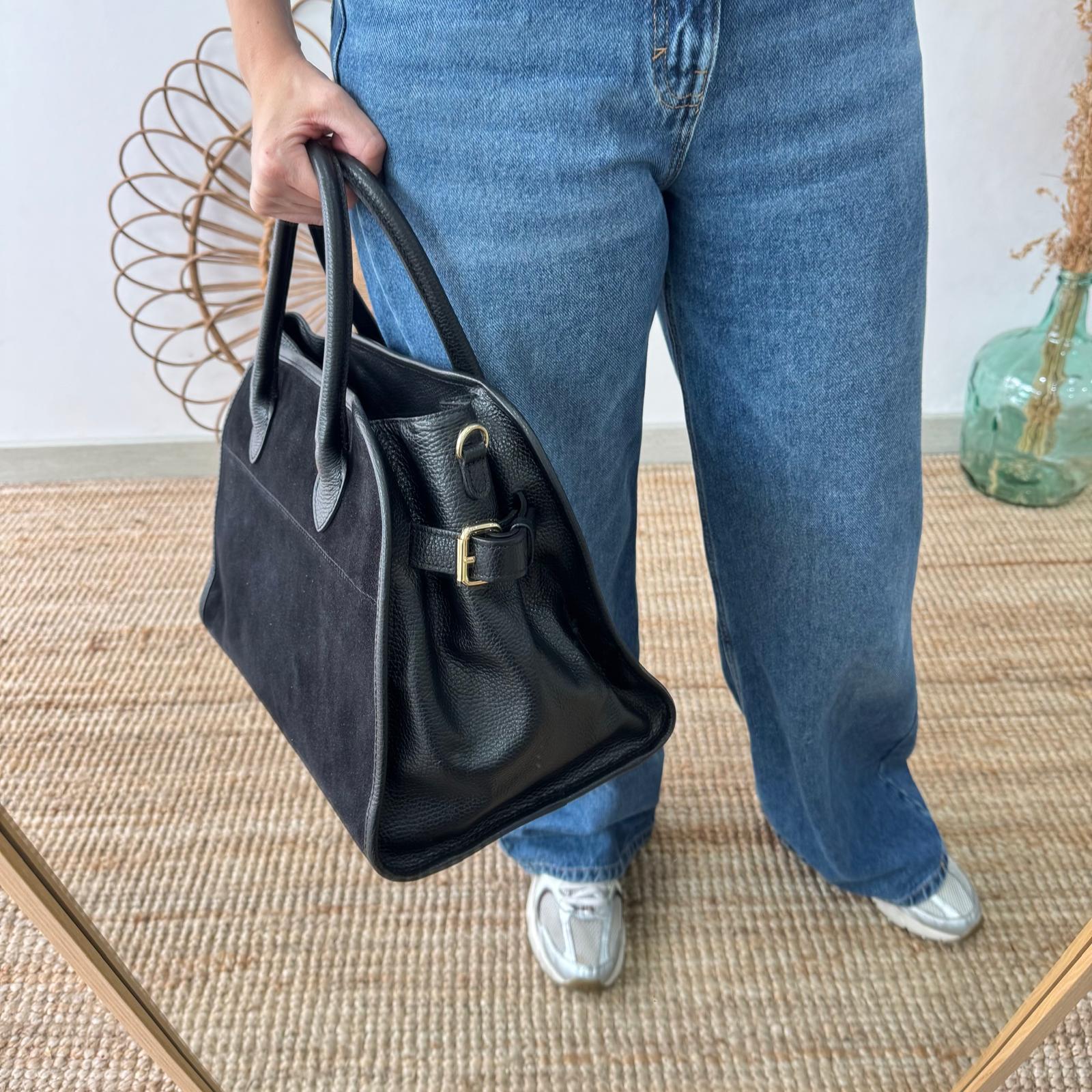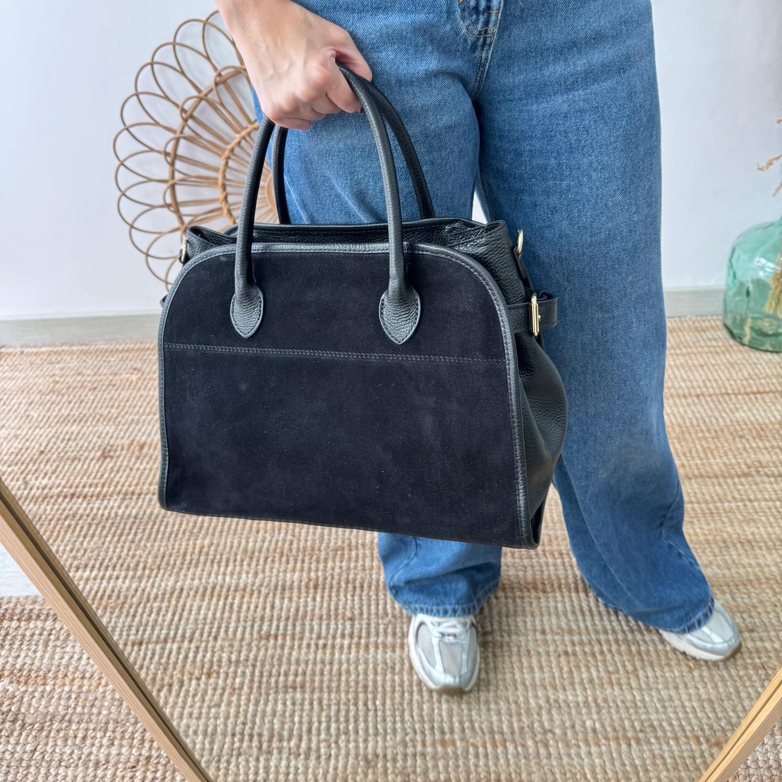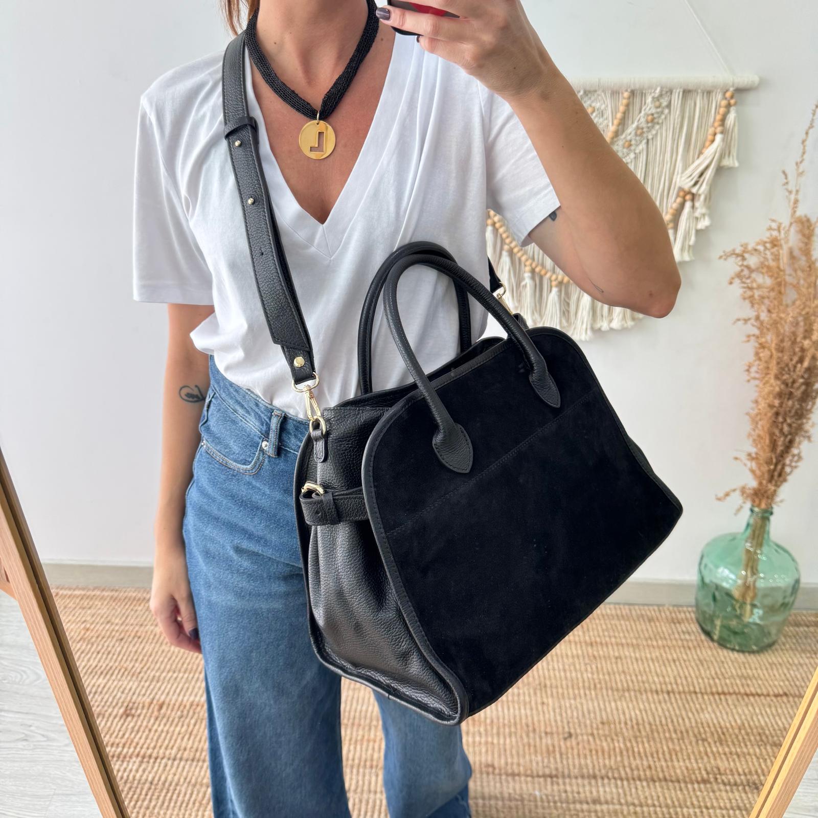 Nuestro bolso shopper con asas de mano en piel de color negro para llevarlo con estilo. Tiene una combinación de piel y serraje, la parte delantera y posterior es de serraje y el resto es de piel.