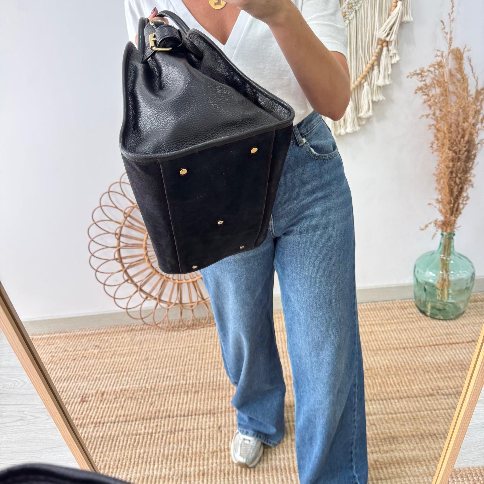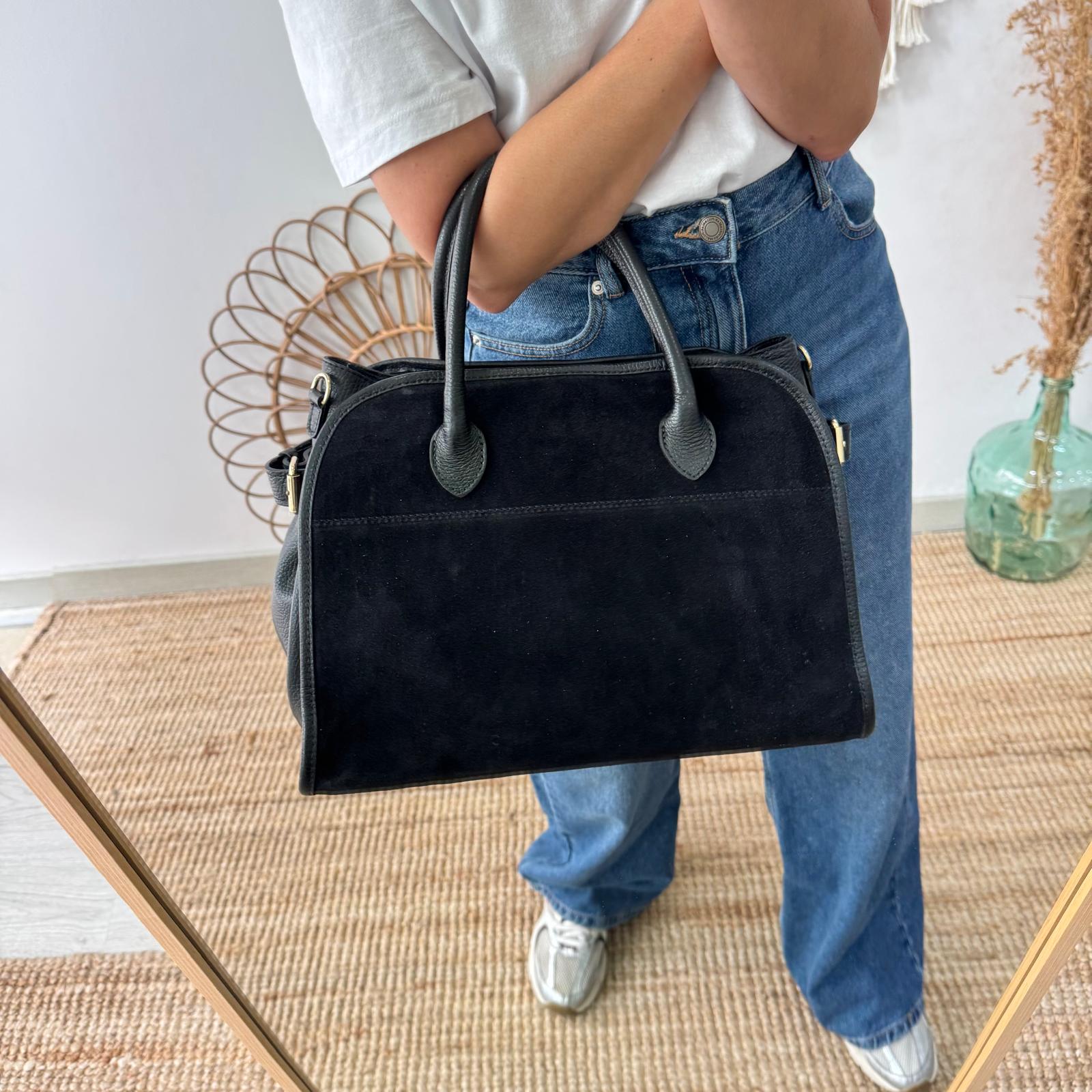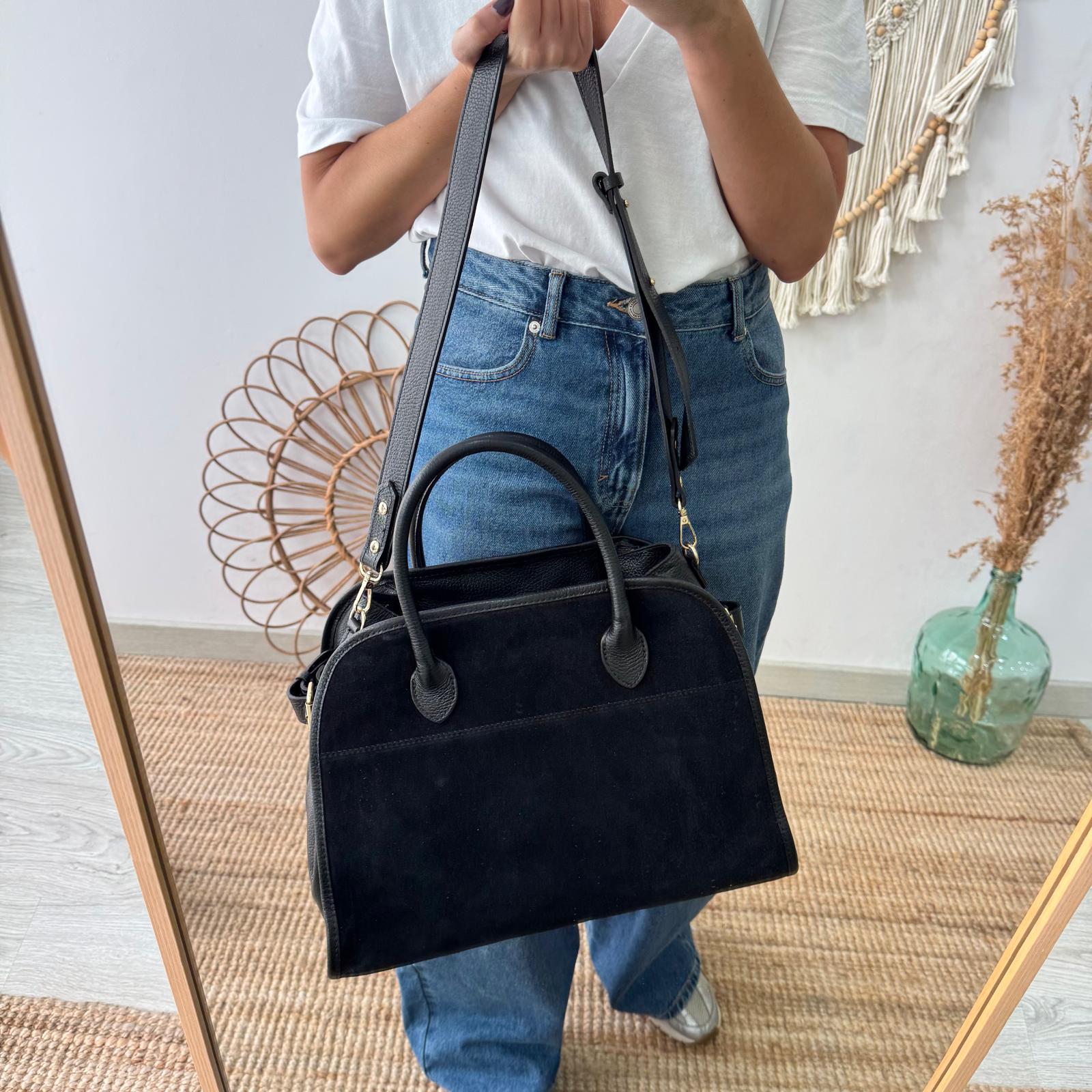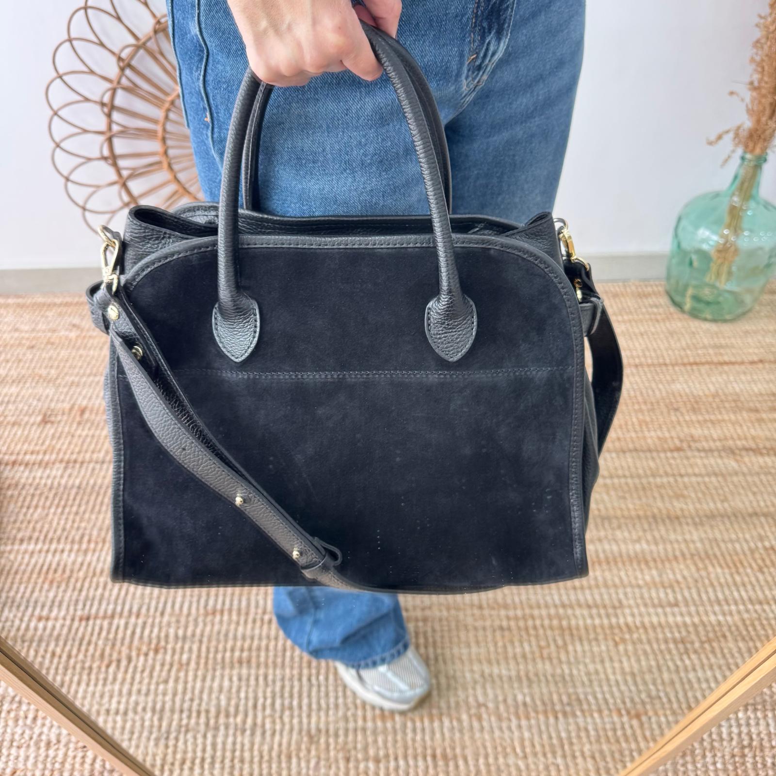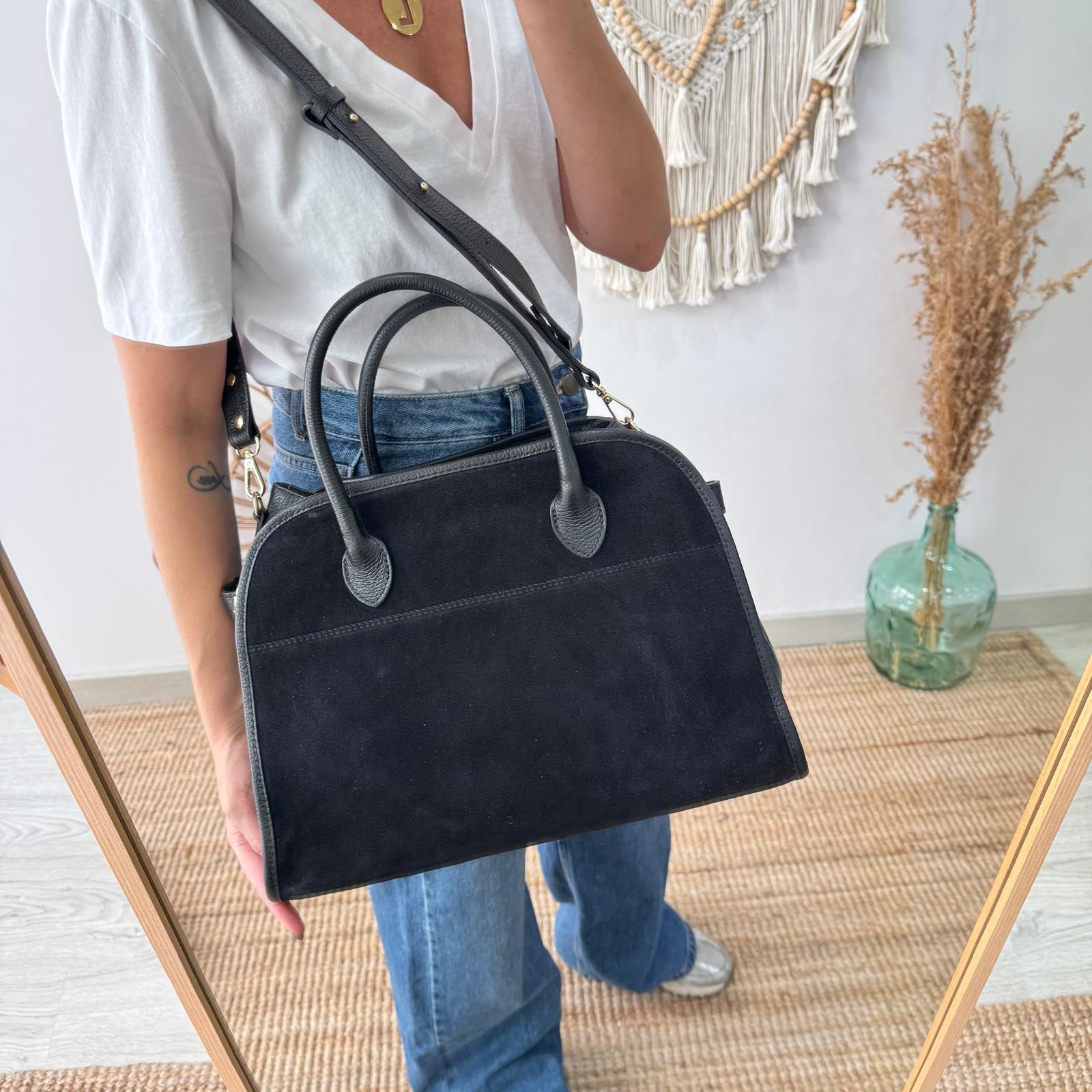 Nuestro bolso shopper con asas de mano en piel de color negro para llevarlo con estilo. Tiene una combinación de piel y serraje, la parte delantera y posterior es de serraje y el resto es de piel.