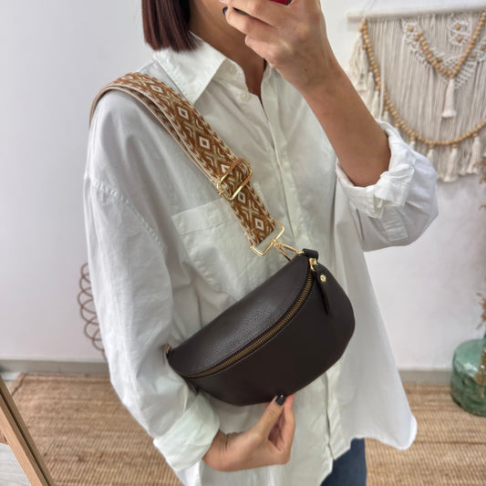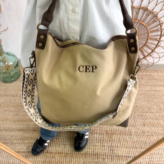 Bolso taupe loneta iniciales bordadas con correa étnica